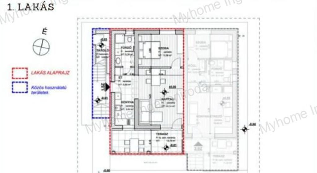 1.lakás : (fsz.) alapterület: 52 m2 + 13,79m2 terasz + 57 m2 kert
