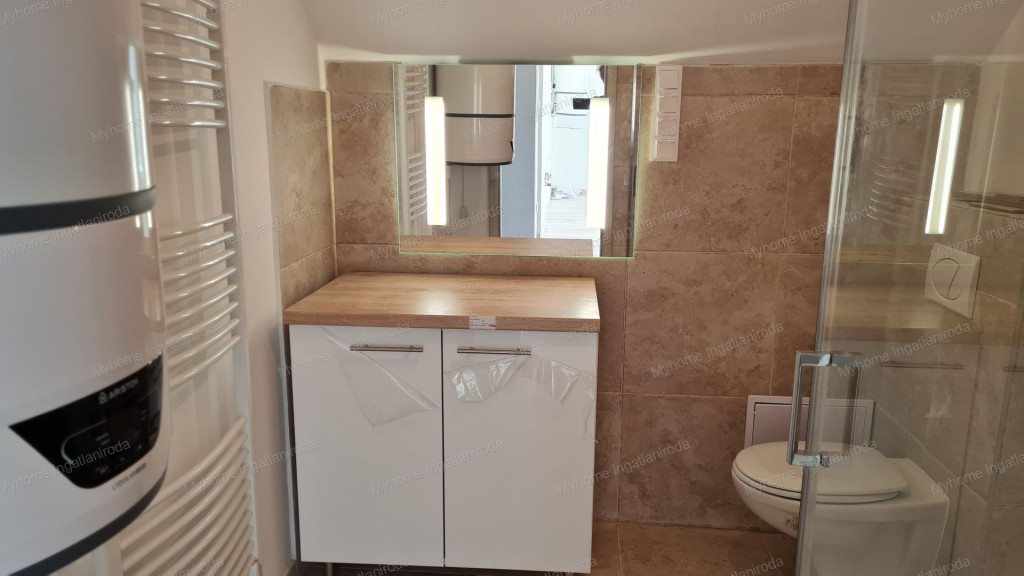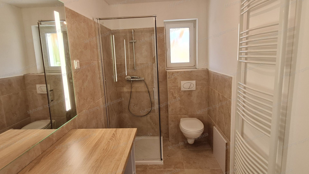 -- Fürdőszobában hőszivattyús törölközőszárító radiátor, Hansgrohe csaptelep, szekrénybe épített Wellis mosdó, Ravak zuhanytálca,ledes beépített tükör.
