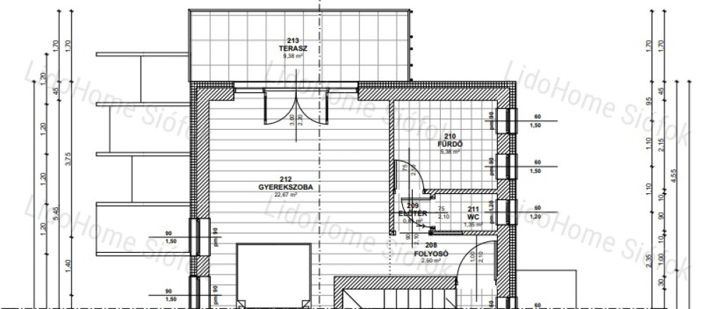 Az első emeleti, új építésű lakás elosztása (lakótér 32 m2 + terasz 9.38 m2):
