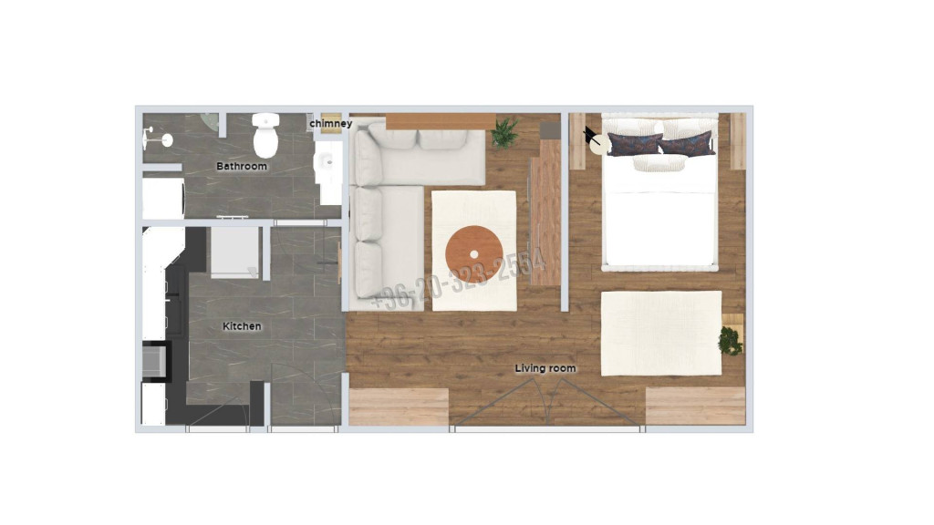 • nappali és háló egybenyíló, praktikus elrendezéssel