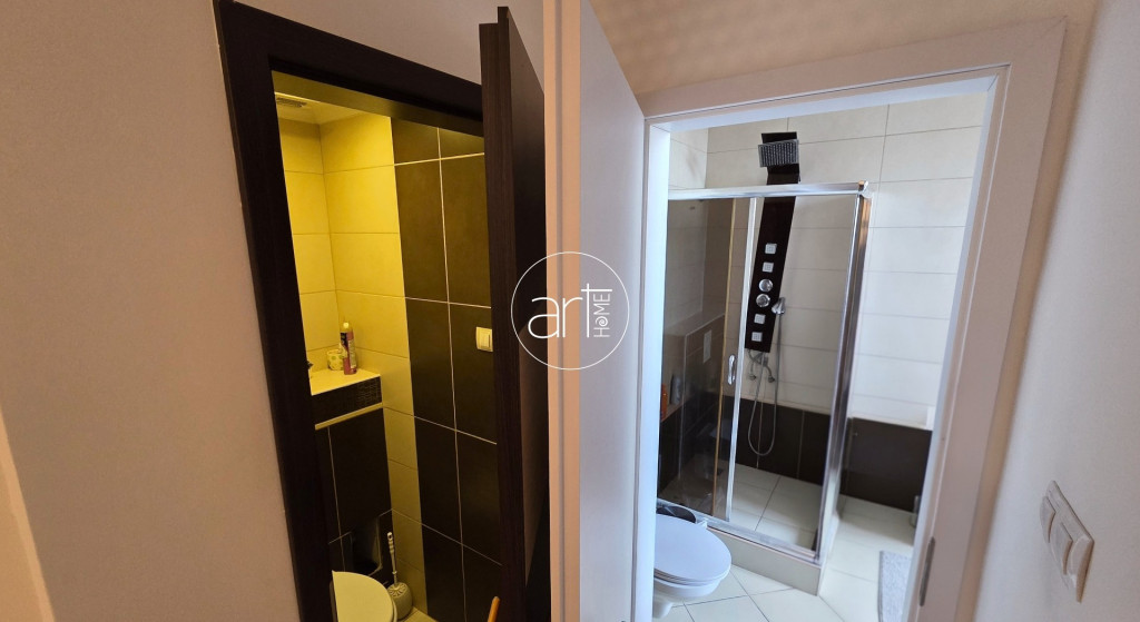 A tágas, napfényes fürdőszobában sarokkád, zuhanyzó, dupla mosdókagyló, WC kapott helyet, emellett az ingatlanban külön mellékhelyiség is megtalálható.