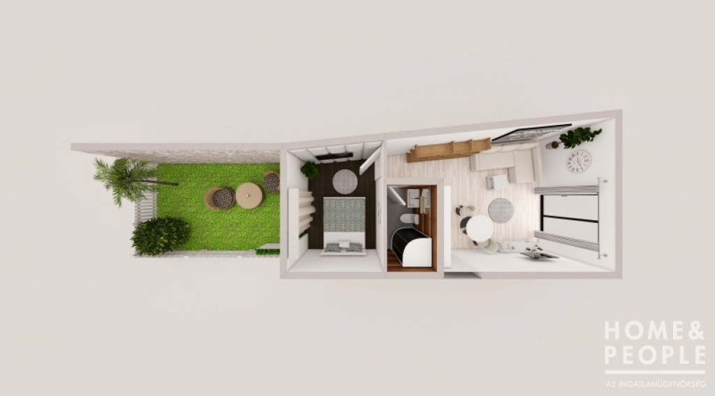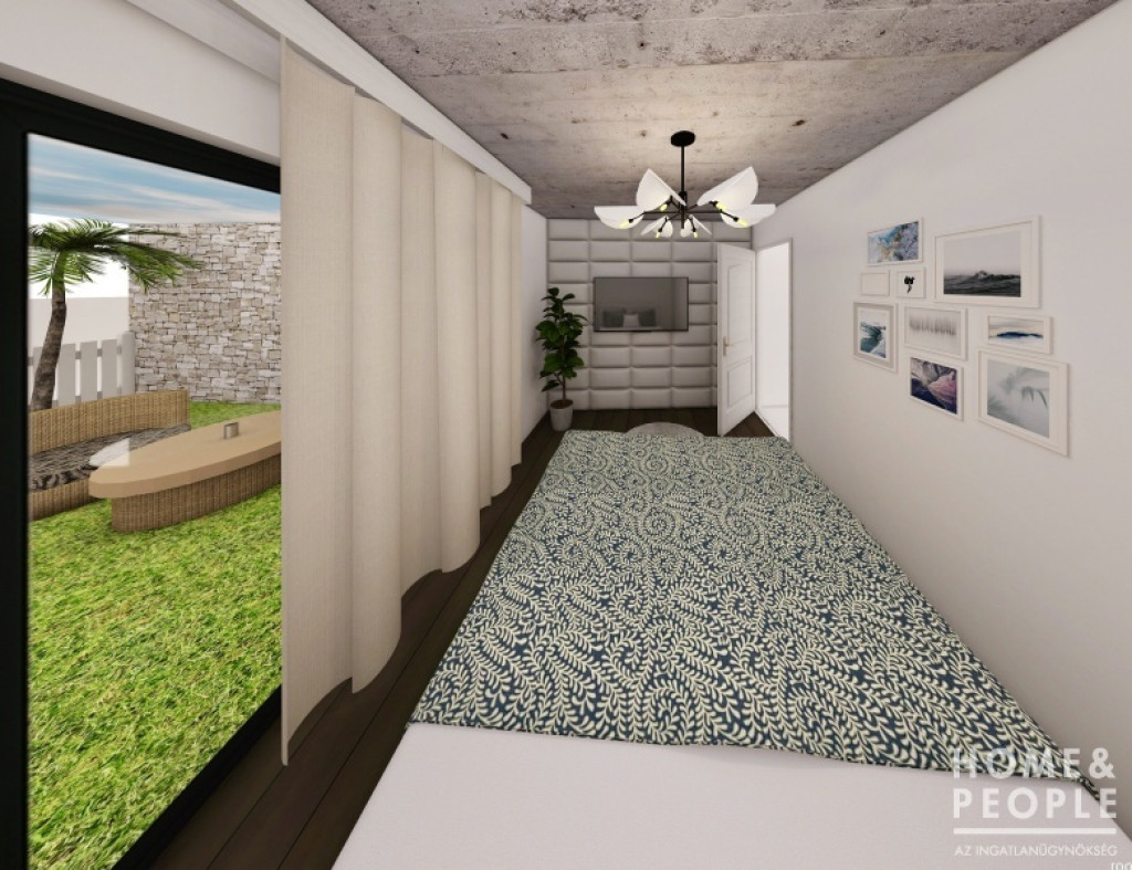 Elosztás: amerikai konyhás nappali, hálószoba, fürdőszoba, kert