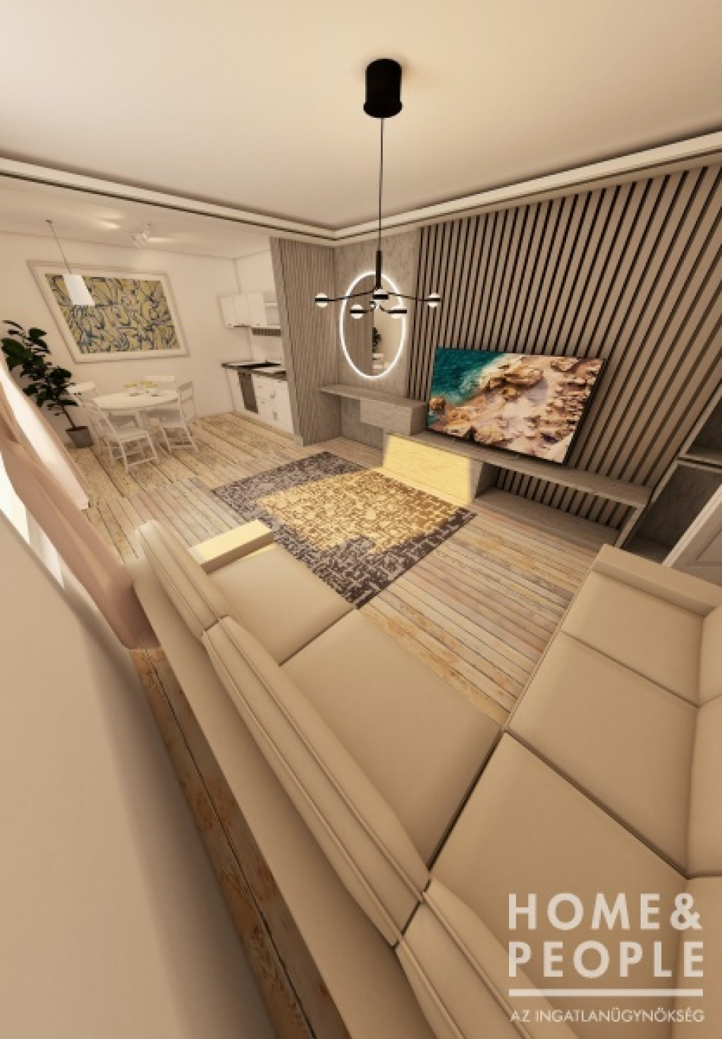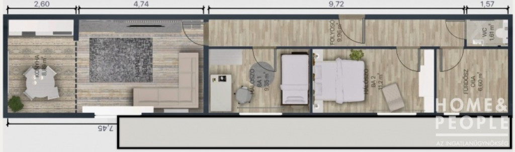 Elosztás: amerikai konyhás nappali, 2 hálószoba, fürdőszoba, wc, 20 m² erkély