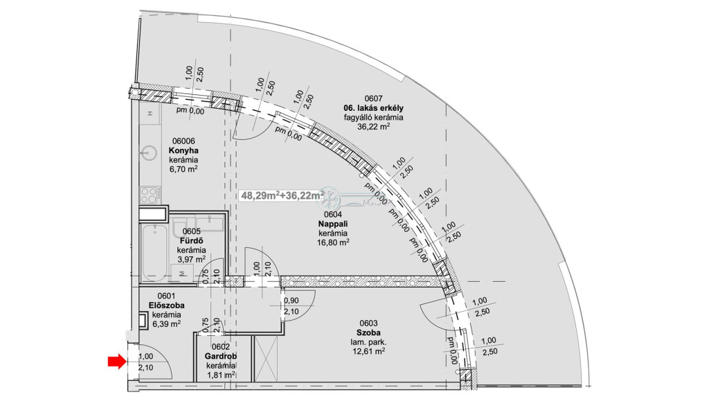Ez a 6.jelű lakás az 1. emeleten helyezkedik el és 48,29 nm alapterülettel + 36,22 nm erkéllyel rendelkezik.
