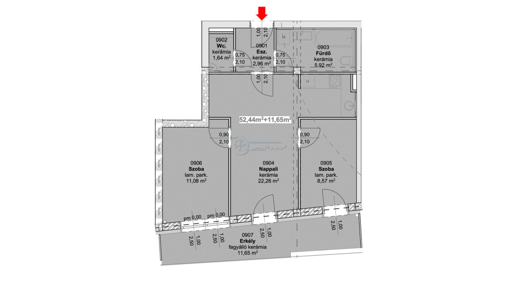 Ez a 9.jelű lakás az 1. emeleten helyezkedik el és 52,44 nm alapterülettel + 11,65 nm erkéllyel rendelkezik.