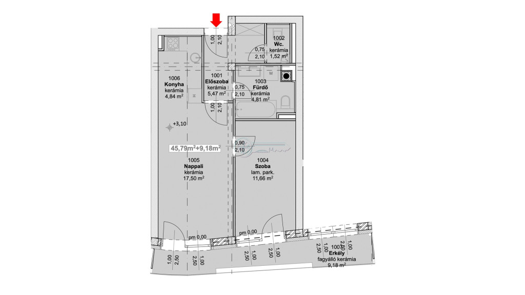 Ez a 10.jelű lakás az 1. emeleten helyezkedik el és 45,79 nm alapterülettel + 9,18 nm erkéllyel rendelkezik.