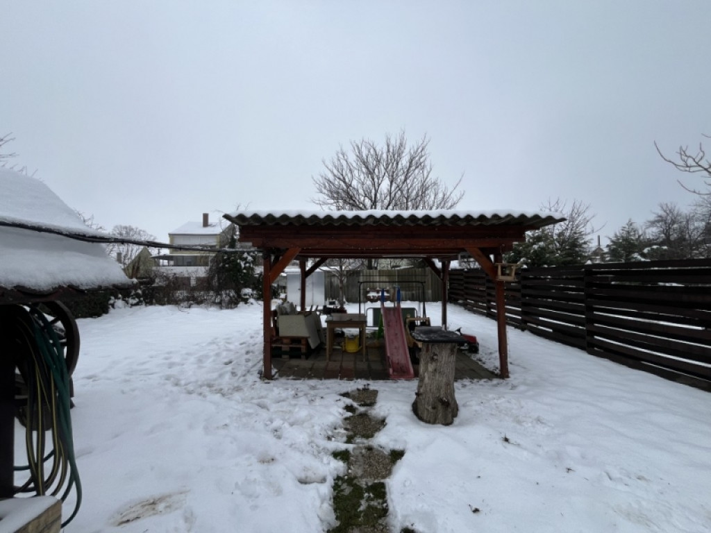 Az ingatlanhoz tartozik egy tágas, 32 m²-es garázs, valamint egy kellemes méretű, elkerített kert, fedett kocsibeállóval – tökéletes hely egy reggeli kávéhoz vagy egy nyugodt esti pihenéshez.