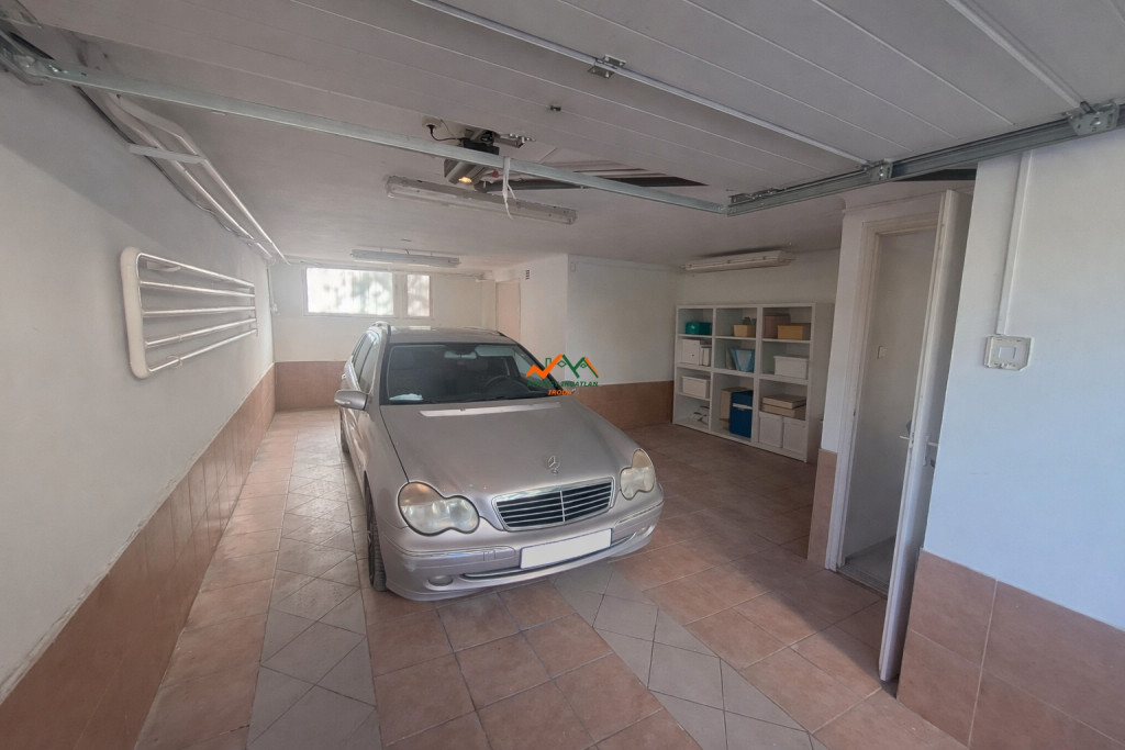A lakás alatt egy tágas, kb. 23 m²-es garázs található, ahol két autó kényelmesen elfér, emellett itt kapott helyet a kazánház és egy vizes blokk is, így tárolásra és egyéb funkciókra is kiválóan alkalmas. a kombicirkó nem rég lett cserélve újra. A garázs előtt további egy saját parkolóhely biztosított, így összesen három autó számára megoldott a parkolás.