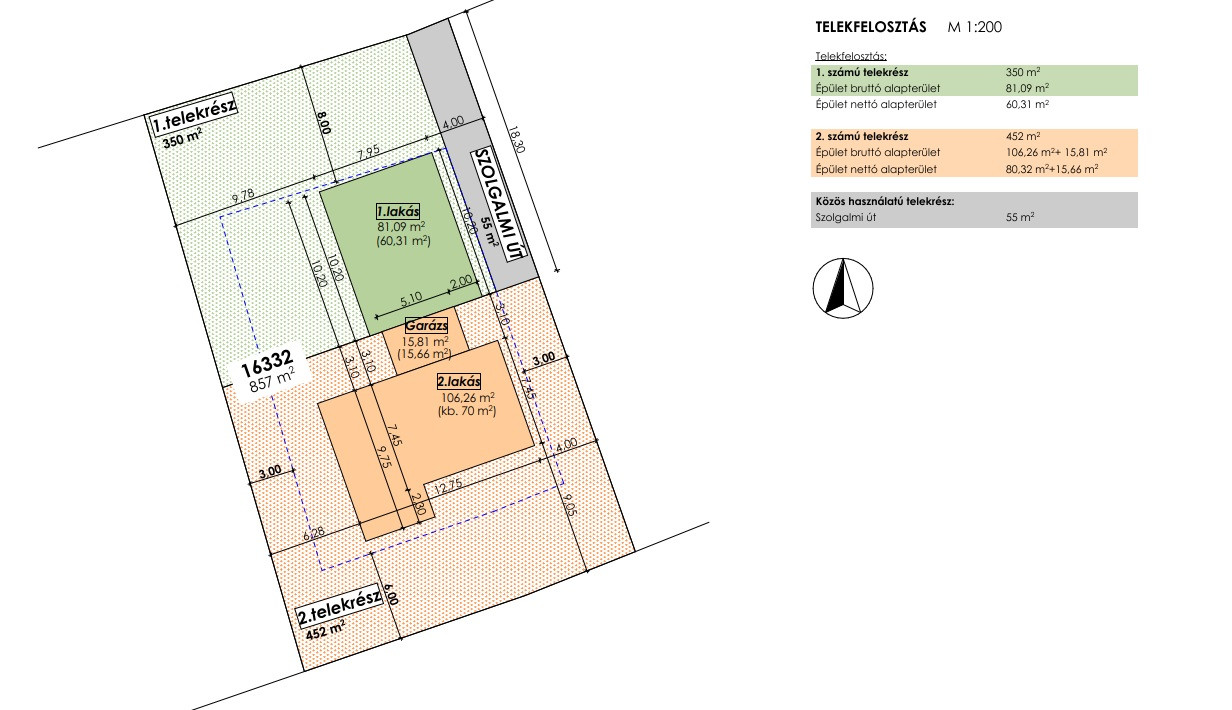 Nappali+2 szoba, bruttó 62m2 nettó 55m2, 365m2-es telekkel.