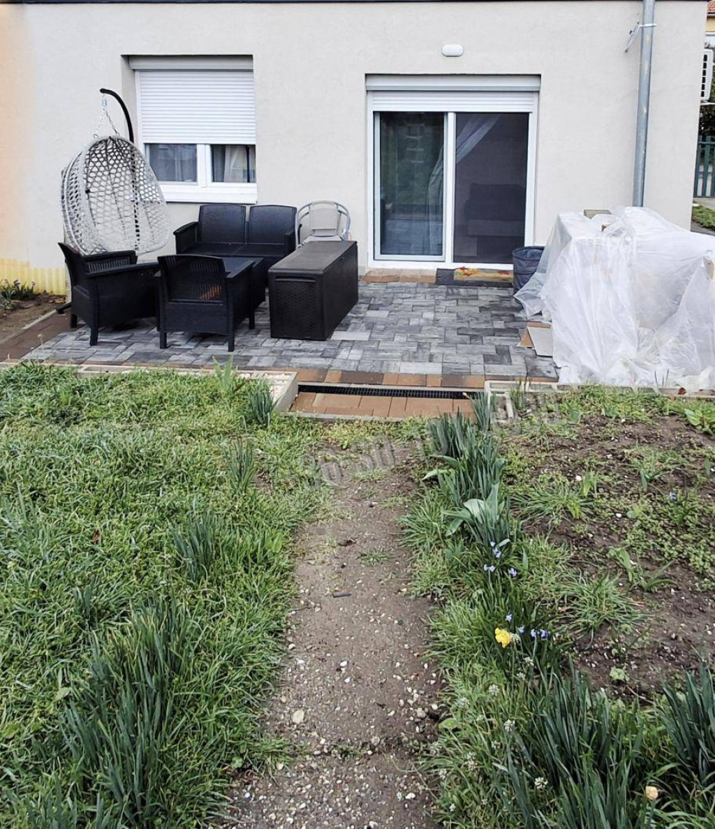 Az ingatlanhoz tartozik egy saját használatú kertrész, amely a teraszról is közvetlenül megközelíthető, valamint egy nagyméretű mobilgarázs, amely kerti tárolóként funkcionál.