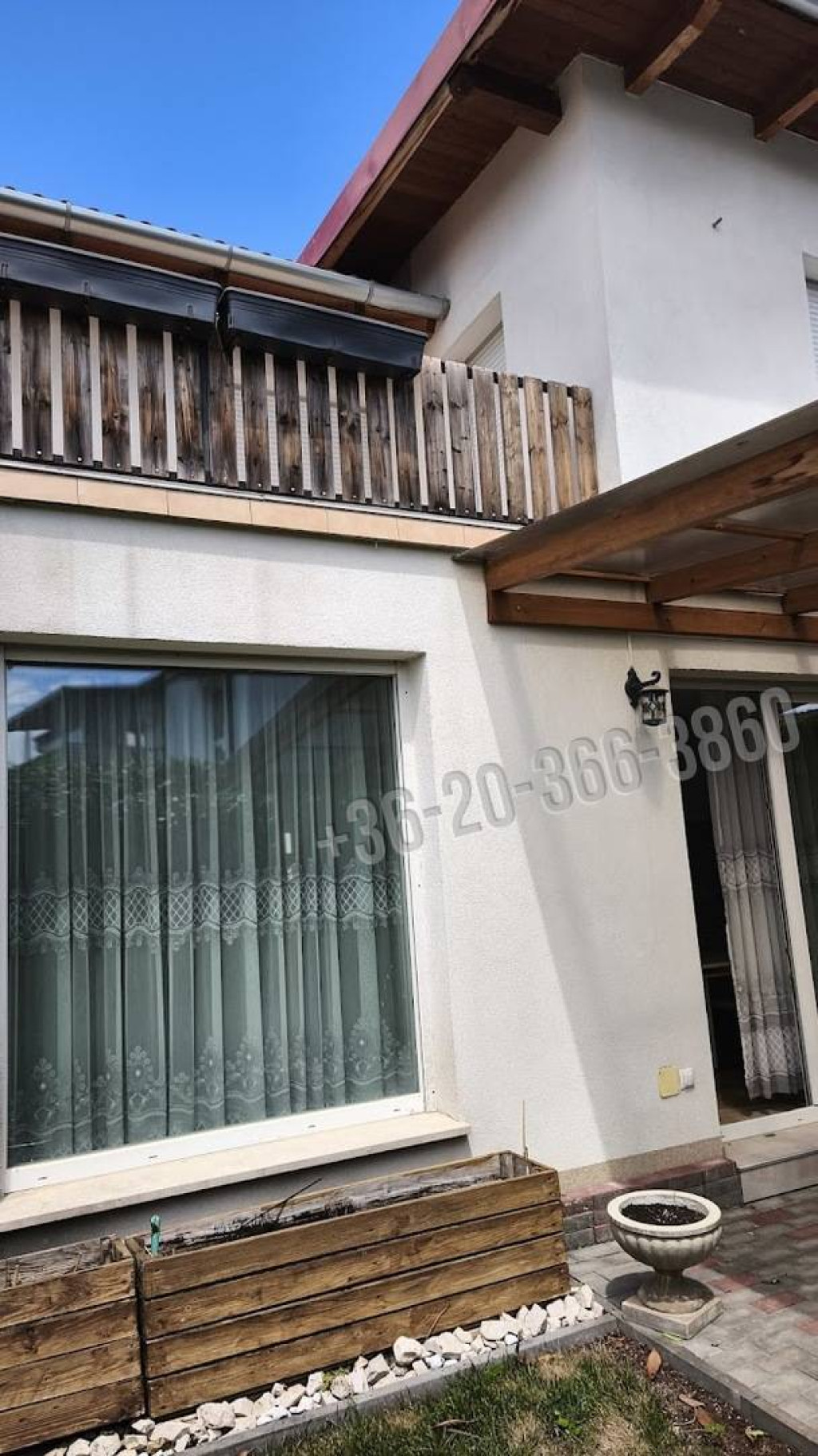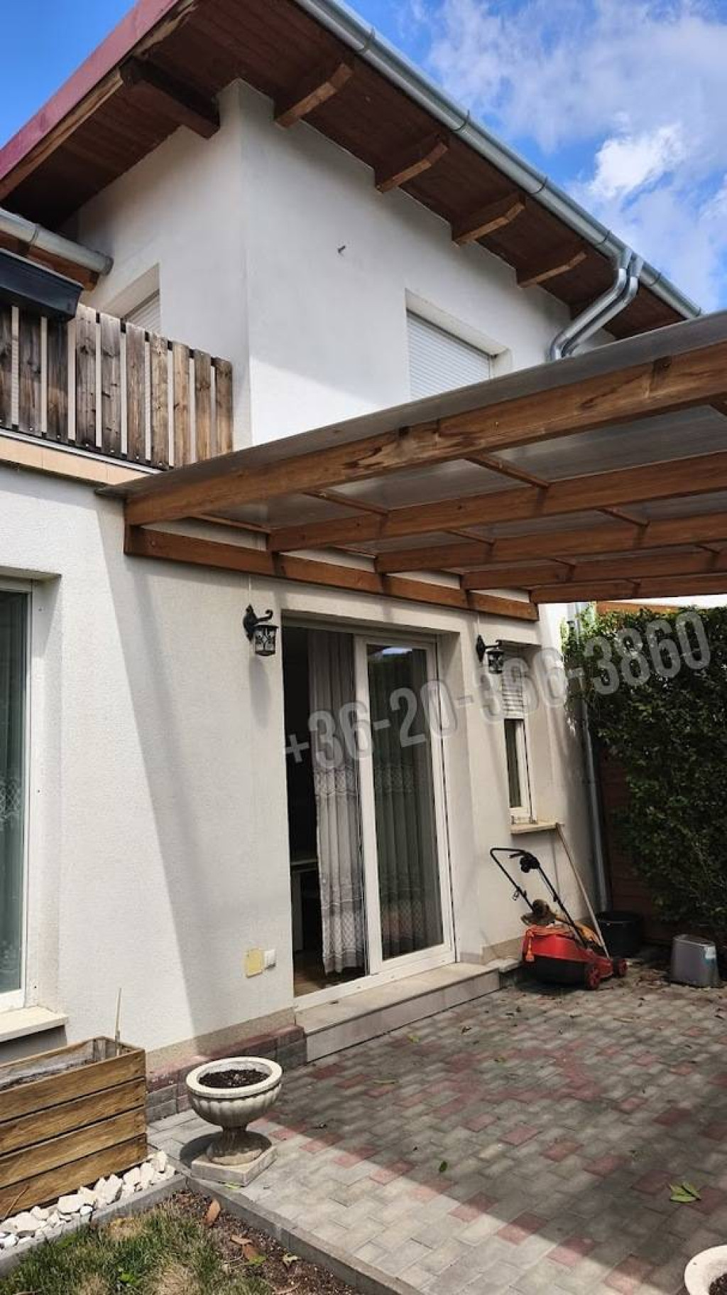 A lakás egy négylakásos épület harmadik egysége. A közterületről minden telekrész önállóan megközelíthető, saját gyalogos és autóbejárati kapun keresztül. A négy telekrész belső kerítéssel van elválasztva egymástól, így biztosítva a privát szférát.