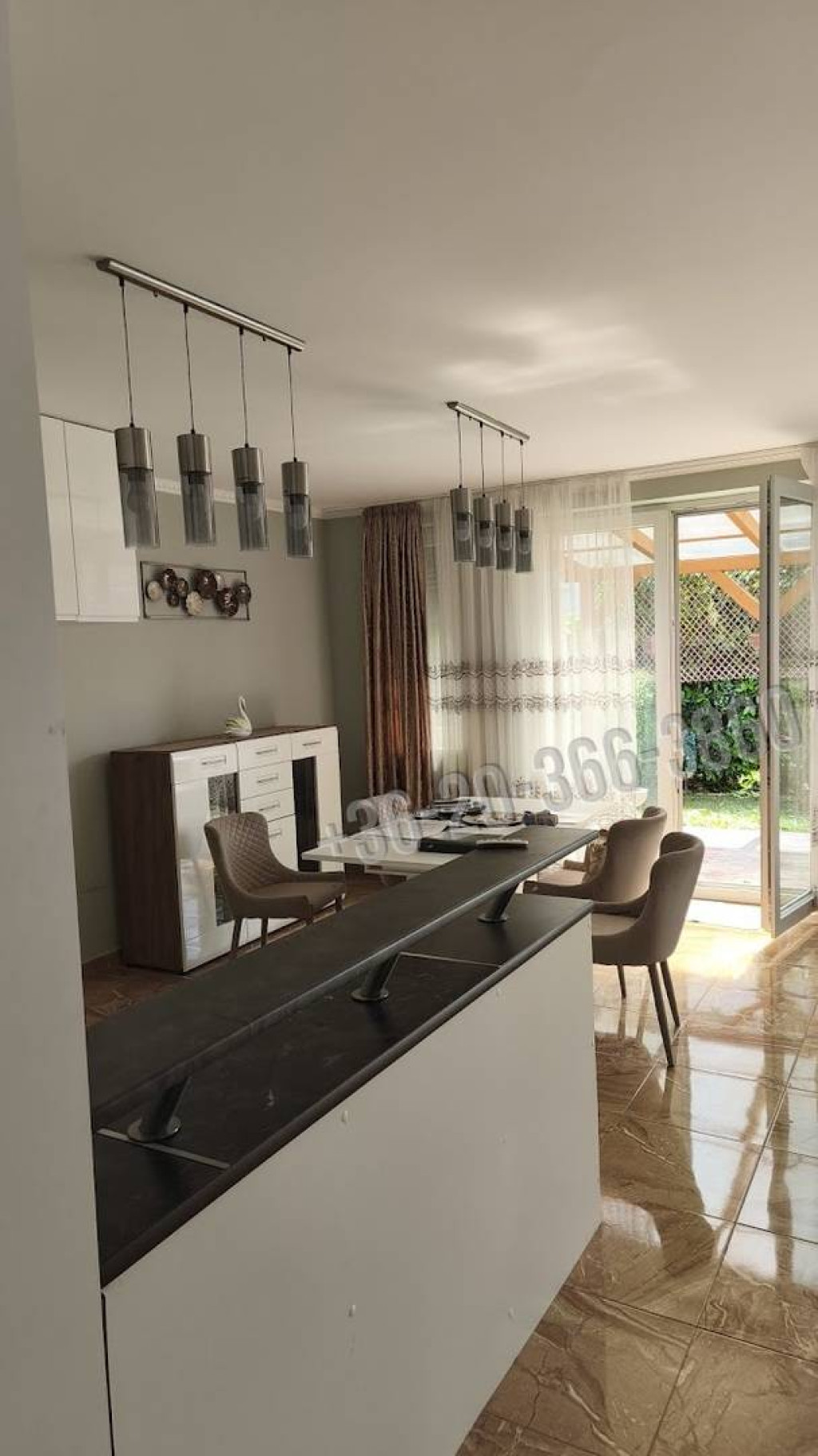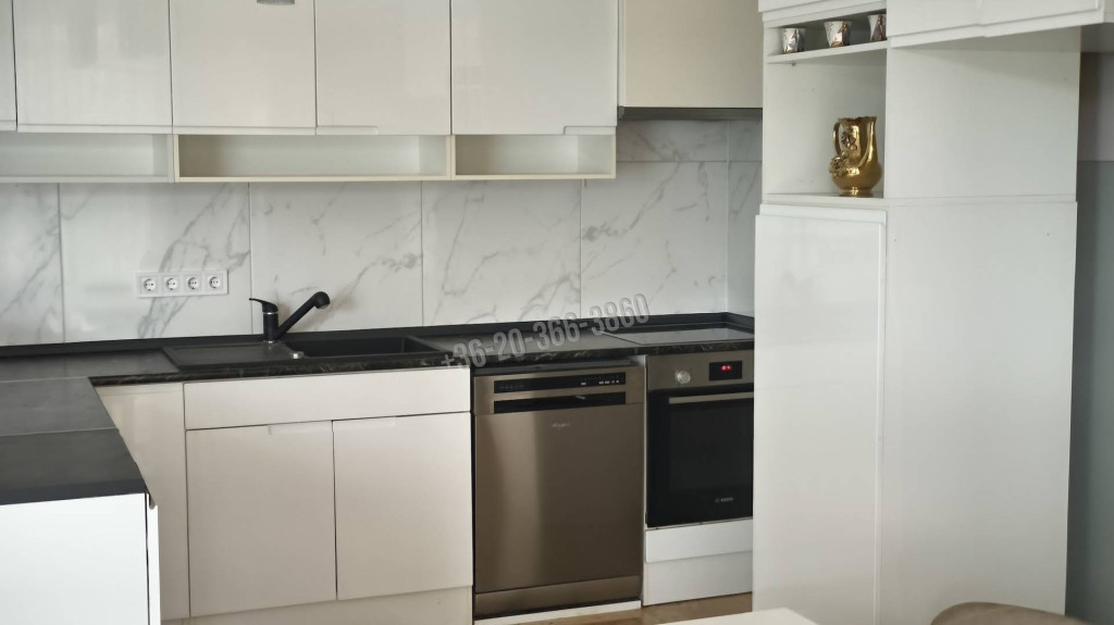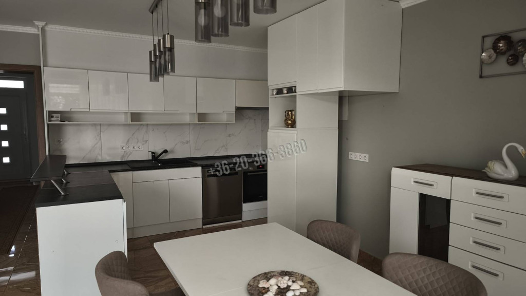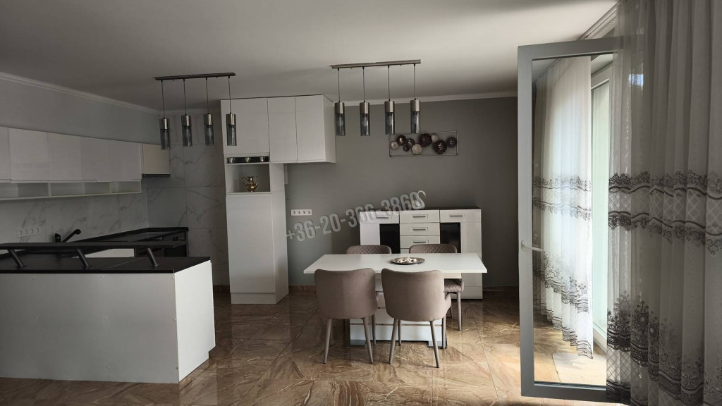 A lakásban egy tágas, mintegy 40 négyzetméteres nappali-étkezős konyha található, amelyből közvetlen kijárat nyílik a teraszra és a kertbe. A vételár részét képezi a képen látható konyhabútor a felszerelésekkel együtt, valamint a függönyök és a csillárok. A lakásban lehetőség van kandalló építésére is.