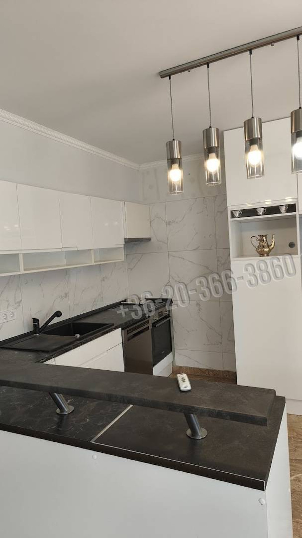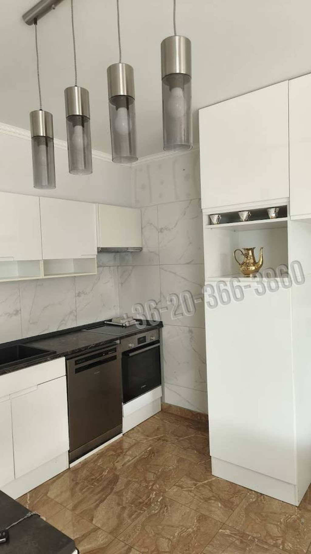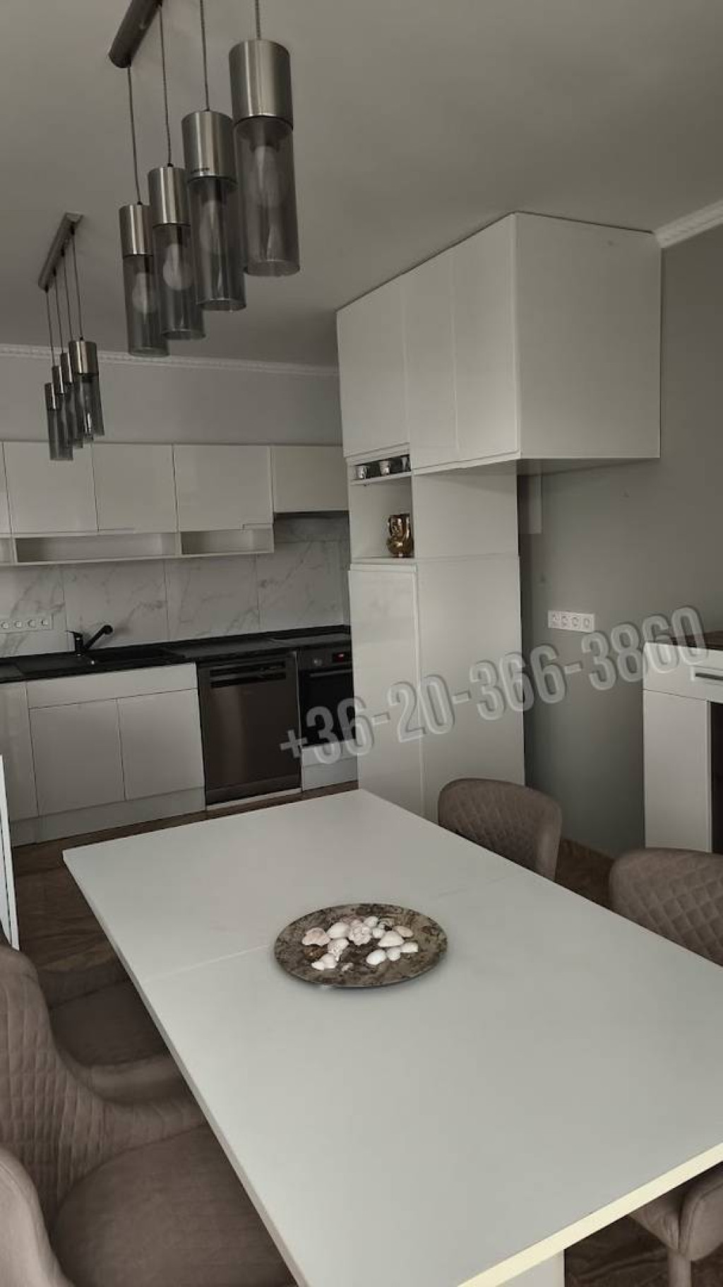 A lakásban egy tágas, mintegy 40 négyzetméteres nappali-étkezős konyha található, amelyből közvetlen kijárat nyílik a teraszra és a kertbe. A vételár részét képezi a képen látható konyhabútor a felszerelésekkel együtt, valamint a függönyök és a csillárok. A lakásban lehetőség van kandalló építésére is.