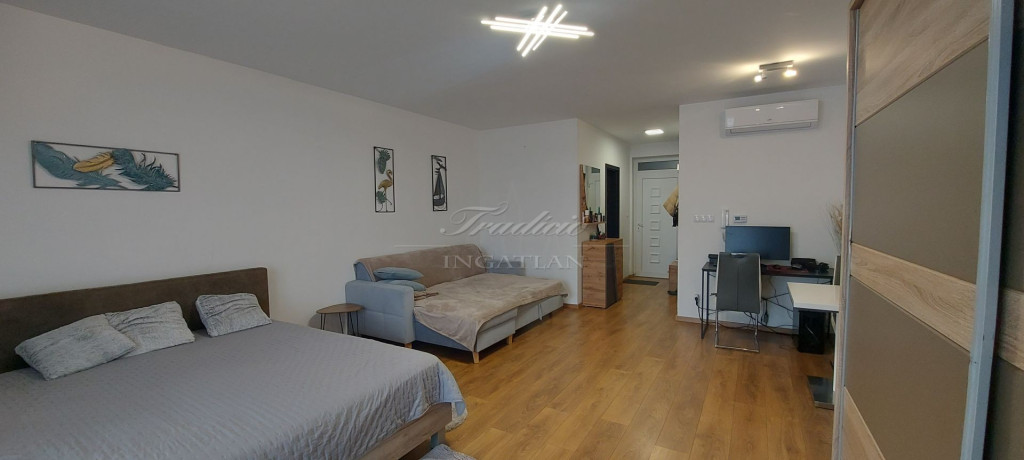 Belépve, az előszobából nyílik a konyha és a zuhanyzó, majd a hatalmas üvegfelülettel rendelkező, hűtő-fűtő klímával ellátott egylégterű nappali-étkező. Igény szerint egy hálófülke kialakítására is van lehetőség.
