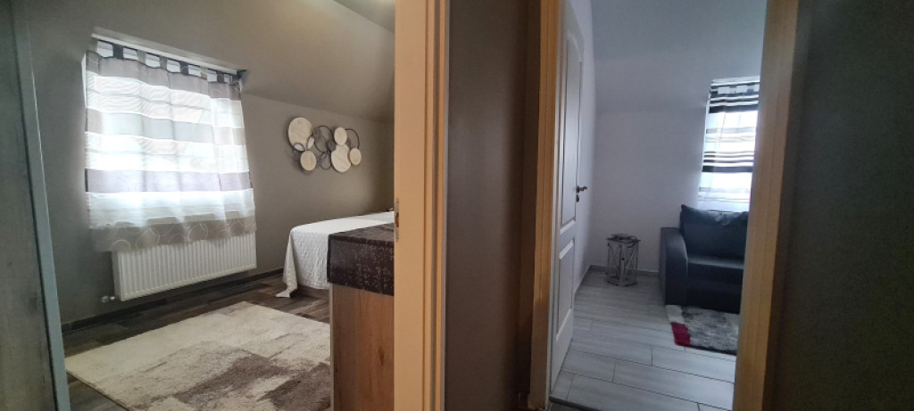Az emeleti részre egy igen kényelmes beton lépcső vezet. Itt található 1 nagy és egy félszoba és egy épített zuhanyzós fürdőszoba.
