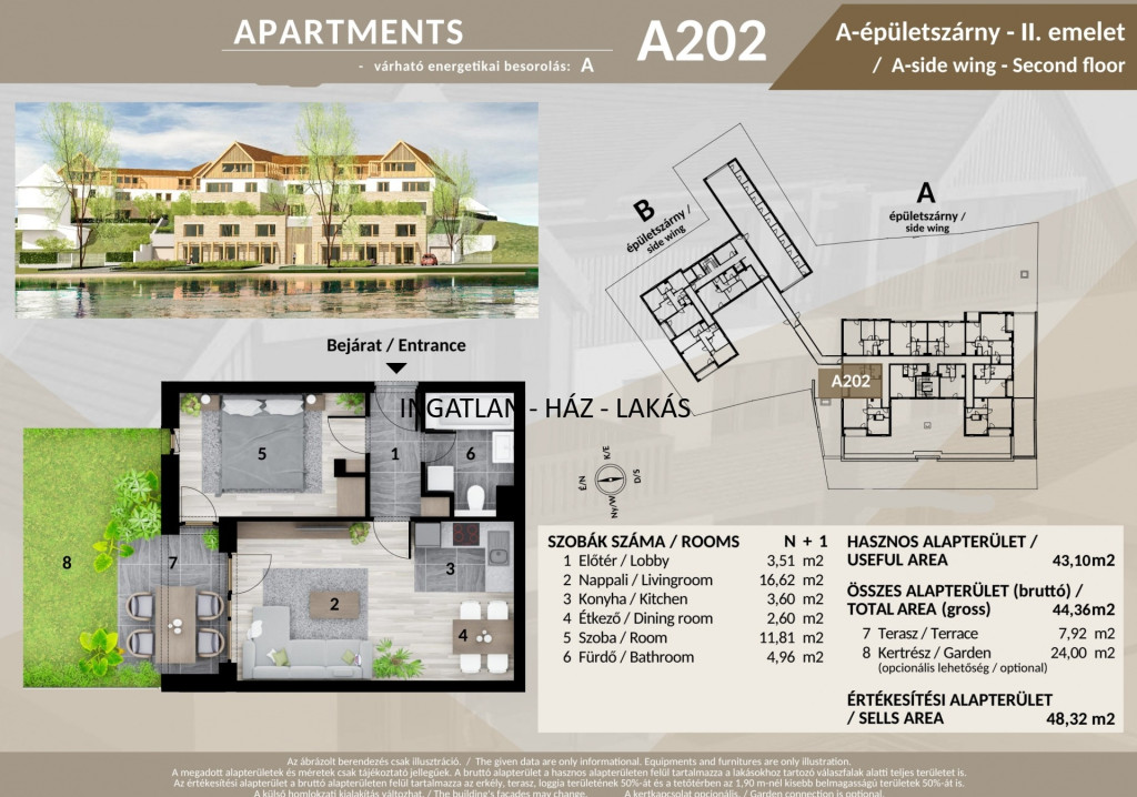 • Két modern épület (A és B) – harmonikus építészeti megoldásokkal