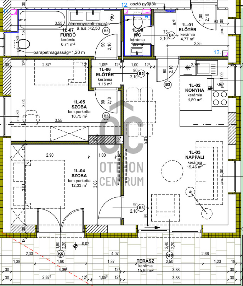 -közbenső födém: 30 cm vasbeton, 7,5 cm aljzatbeton, 6 cm Austrotherm EPS AT-L2 lépésálló hangszigetelés, padlófűtés, burkolat