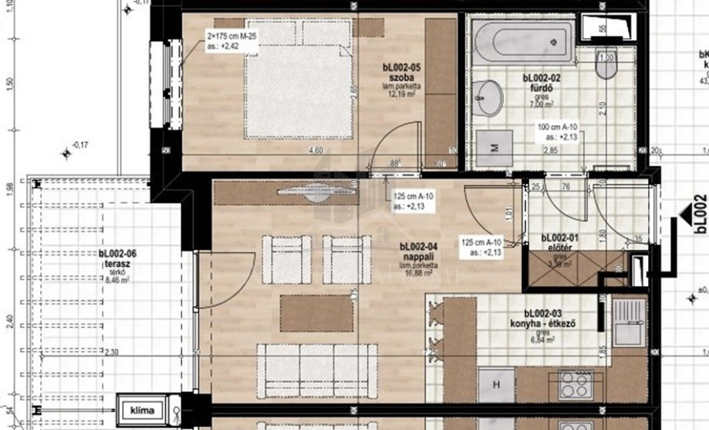 A BL002-es lakás, földszinti, 46,45 m2 alapterületű, amihez 8,76 m2-es terasz tartozik.