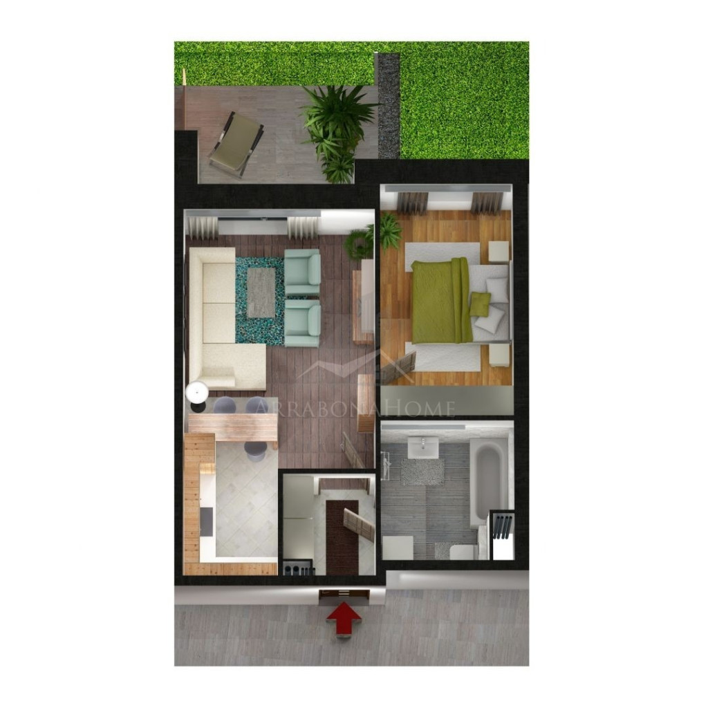 Elosztását tekintve: előtér, nappali-konyha-étkező, 1 szoba, fürdőszoba.