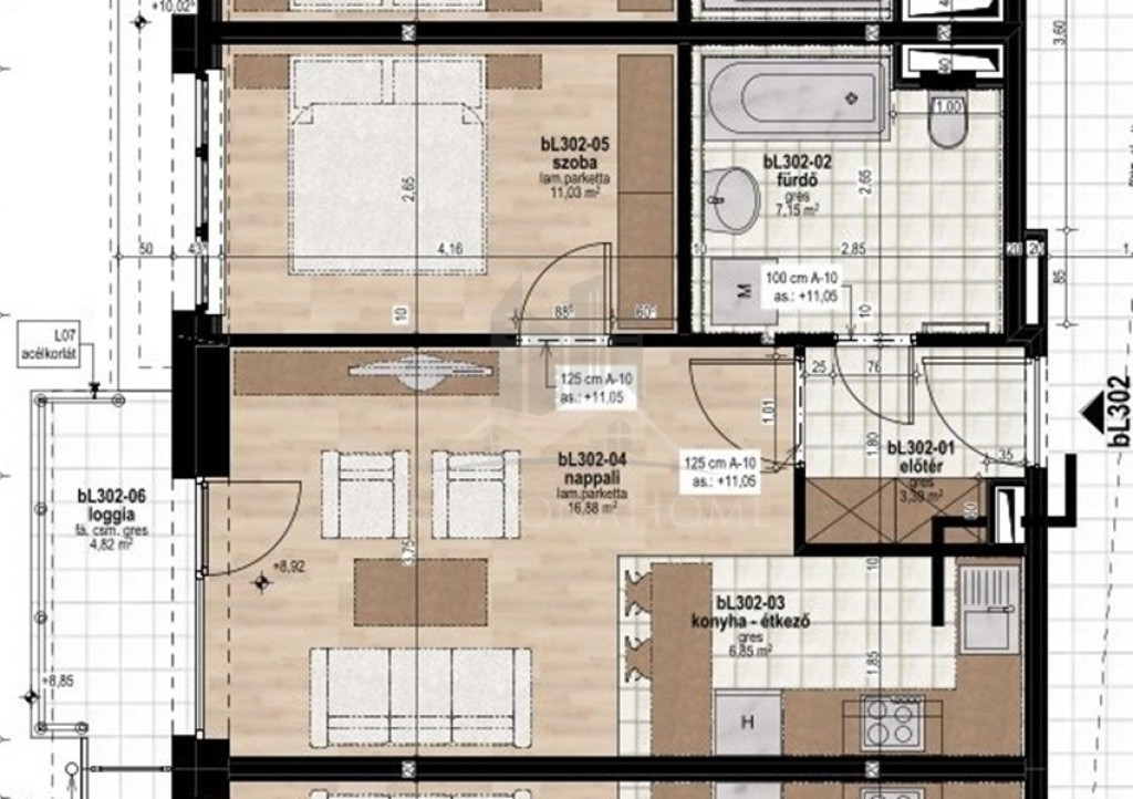 A BL302-es lakás, 3. emeleti, 45,3 m2 alapterületű, amihez 4,82 m2-es erkély tartozik.