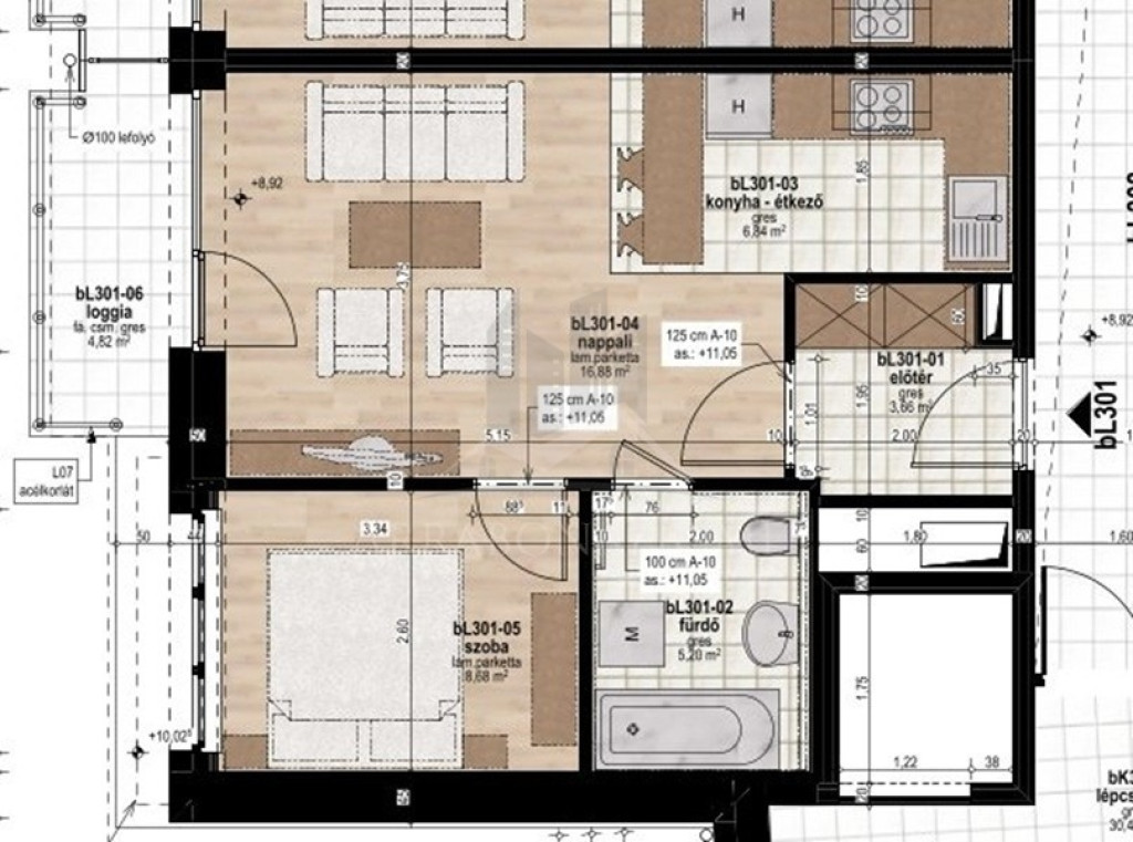 A BL301-es lakás, 3. emeleti, 41,26 m2 alapterületű, amihez 4,82 m2-es erkély tartozik.