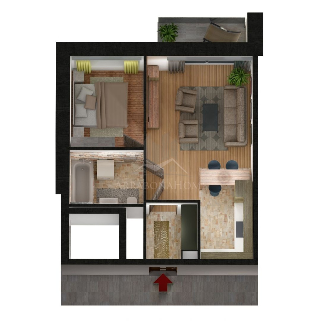 Elosztását tekintve: előtér, nappali-konyha-étkező, 1 szoba, fürdőszoba.