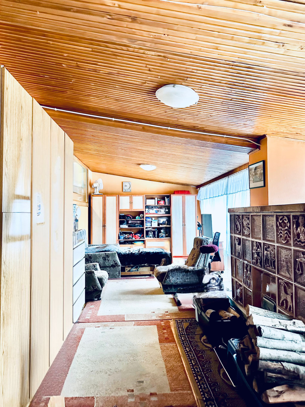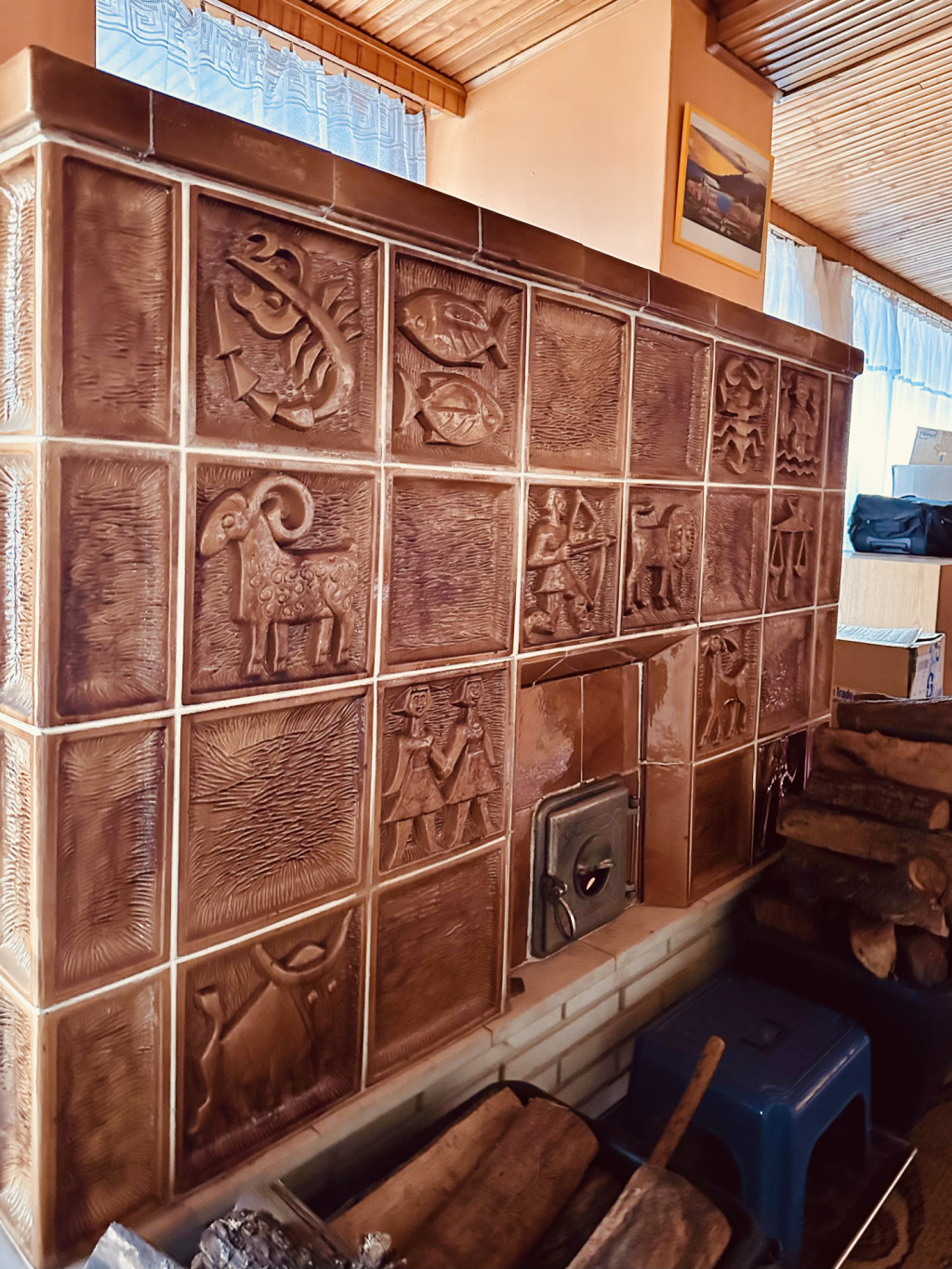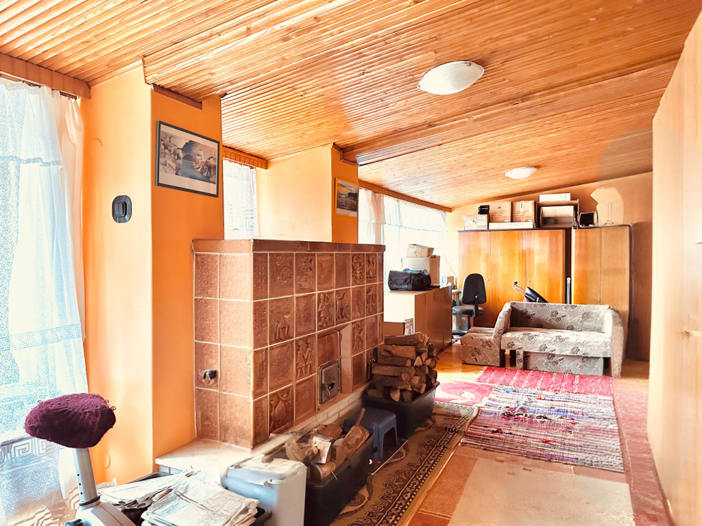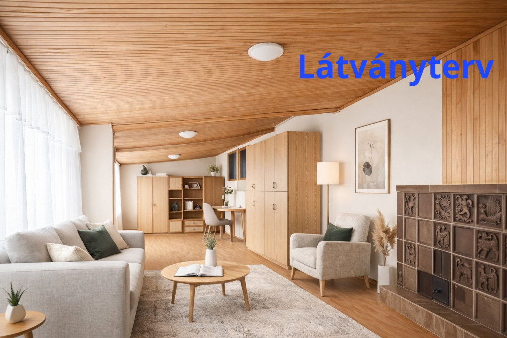 melynek közepén egy különleges cserépkályha teremti meg az otthon meleg, karakteres hangulatát.