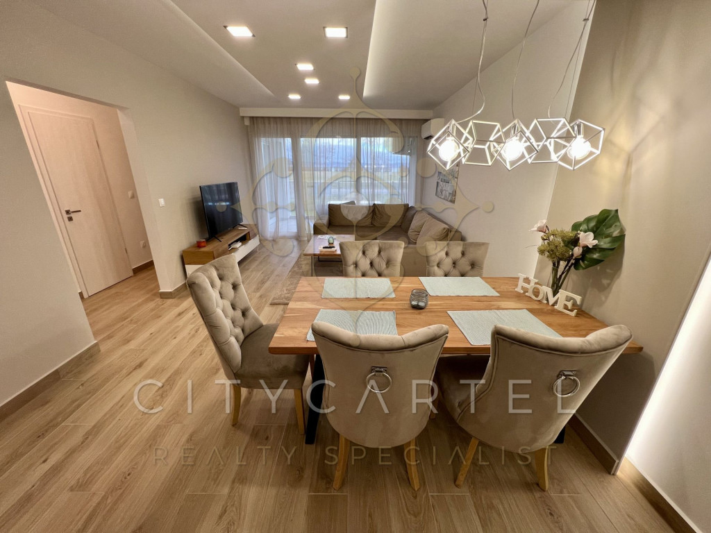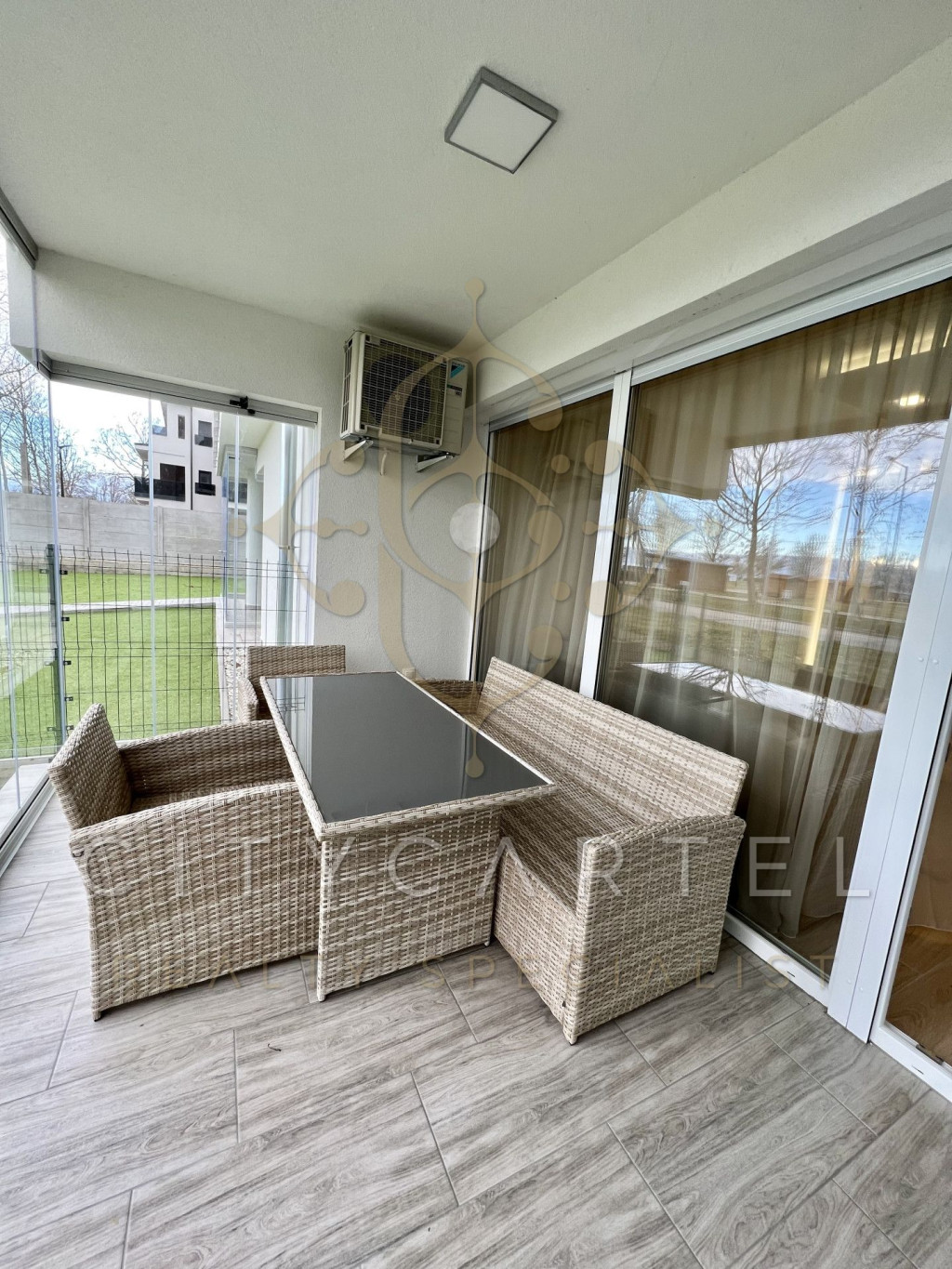 Beosztását tekintve egy amerikai konyhás nappali + étkező egy légtérben, kettő hálószoba, egy előszoba, egy WC, egy zuhanyzós fürdőszoba, valamint egy kertkapcsolatos, üvegfüggönyözött terasz került benne kialakításra.