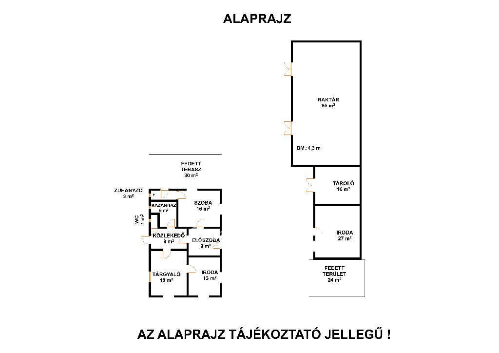 A 2. épület raktár és műhelyfunkciót lát el: egy 95 m2-es, 4,3 méter belmagasságú raktárból, egy 16 m2-es tárolóból és egy 27 m2-es irodából áll, valamint egy 24 m2-es fedett terület is tartozik hozzá. Az ingatlan 380V ipari árammal ellátott, így kiválóan alkalmas műhelynek, logisztikai központnak, telephelynek vagy raktározási célokra.