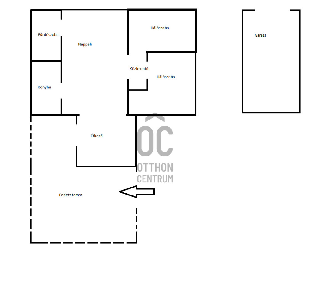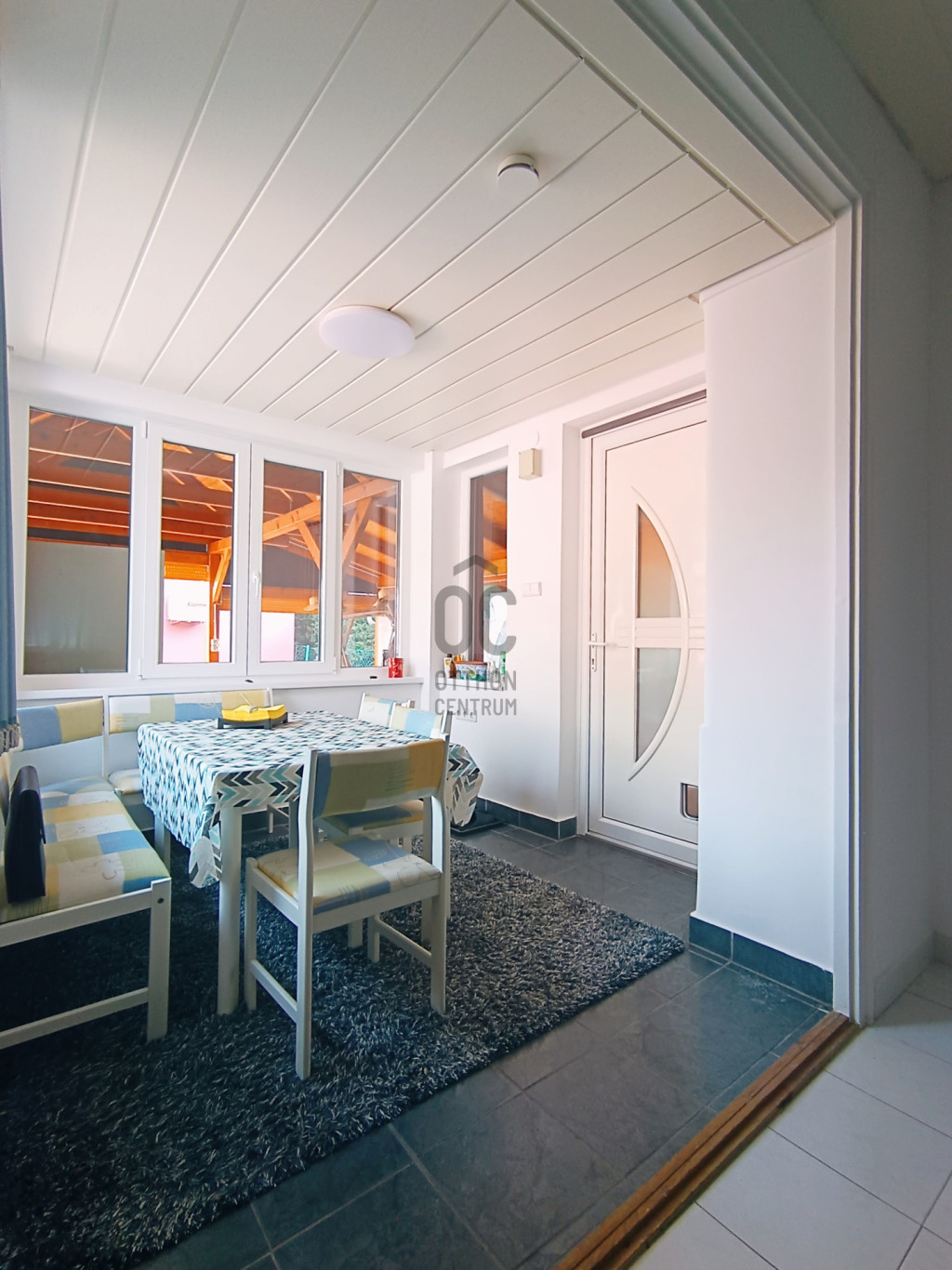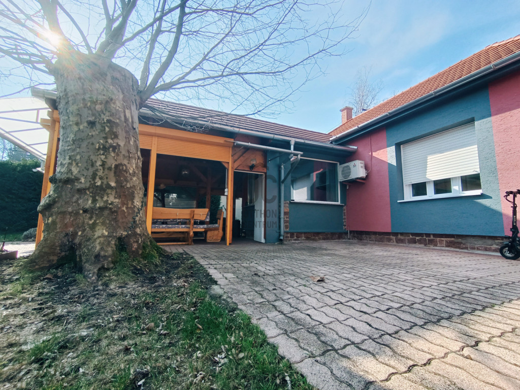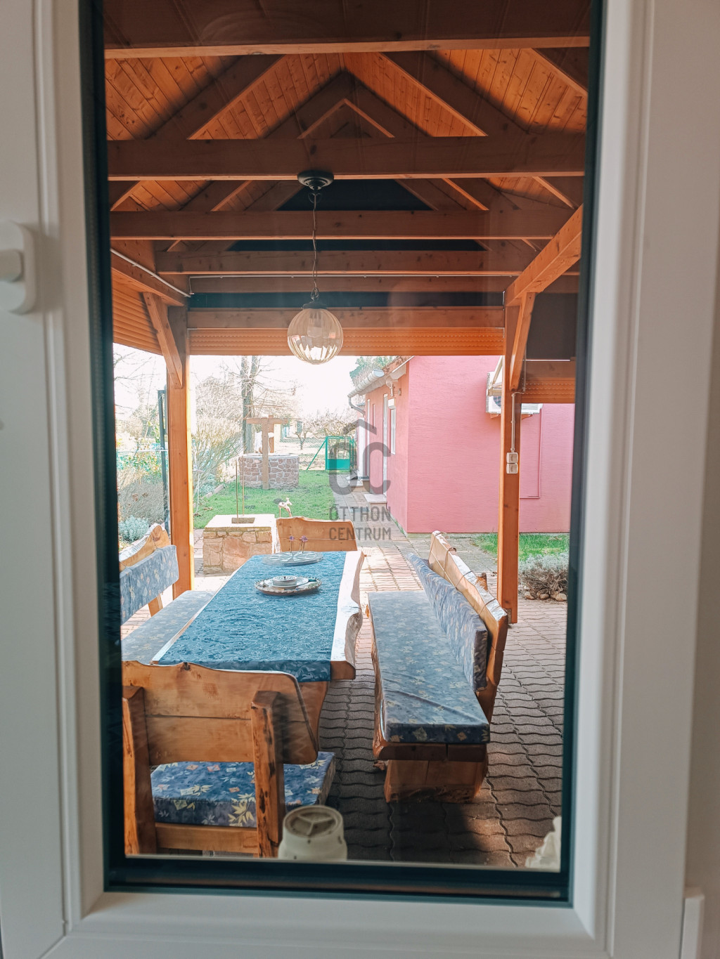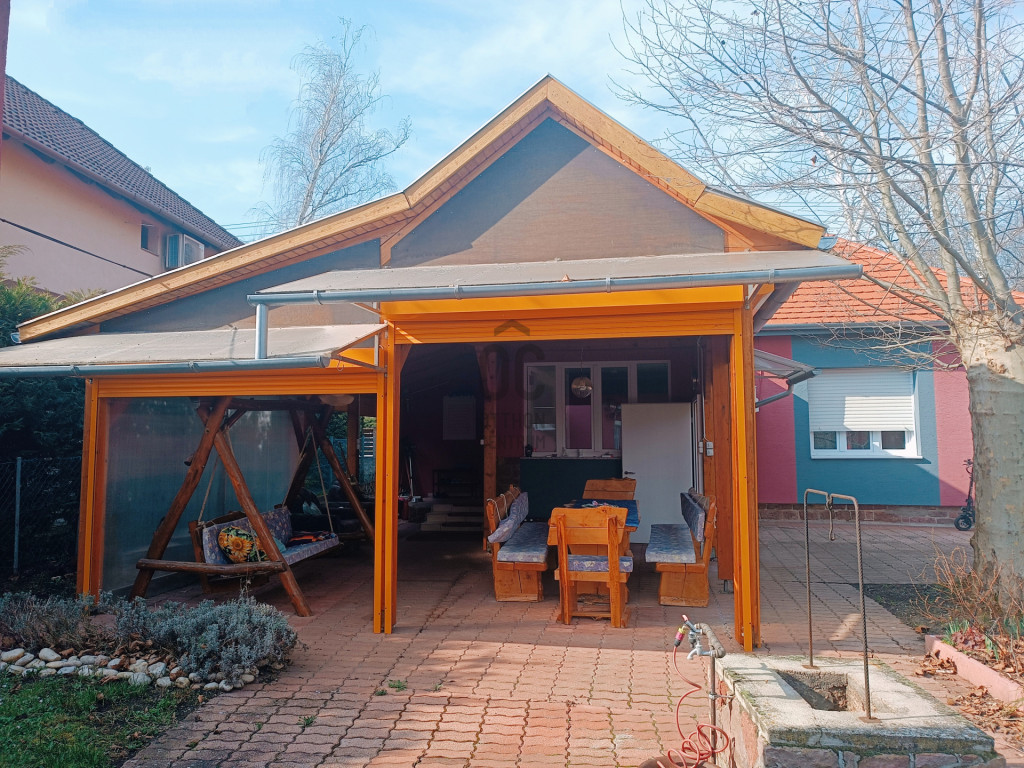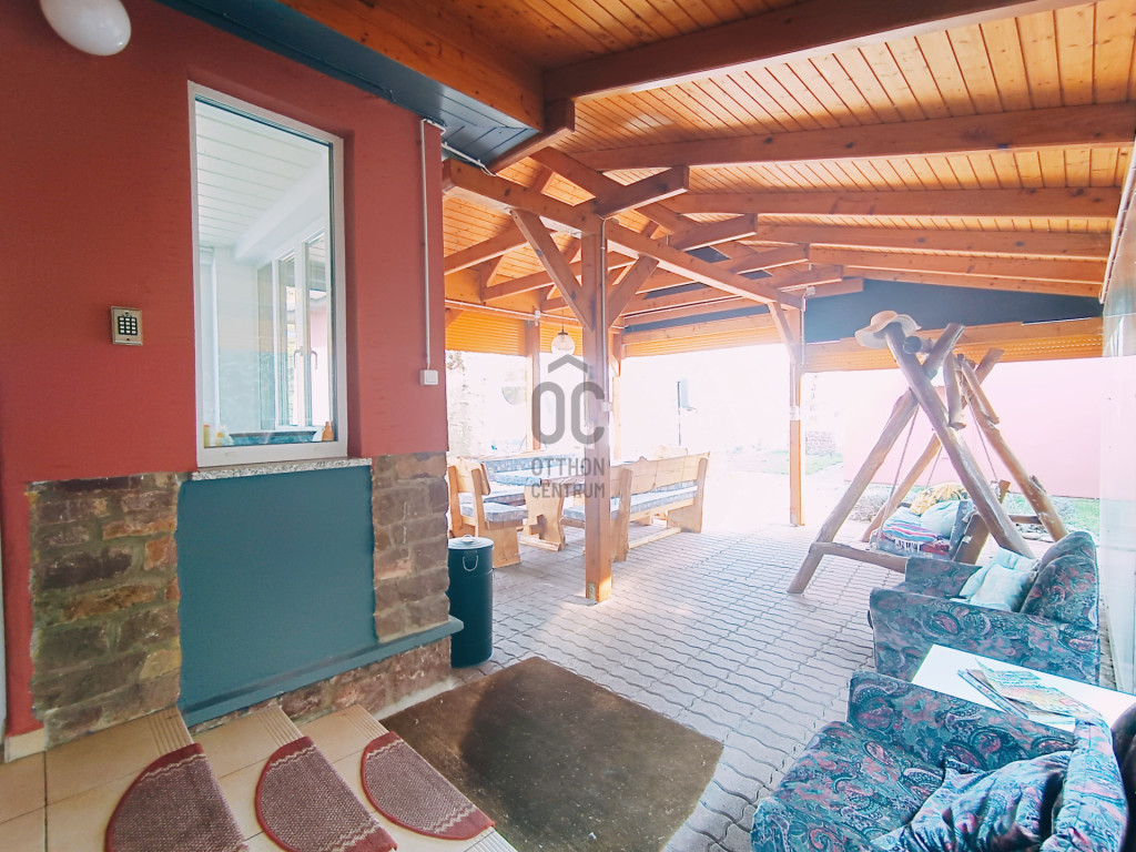 A bejárat előtt kényelmes, árnyas, fedett, 22 nm-es teraszt alakítottak ki, ahol egy egész család és a vendégsereg elfér.