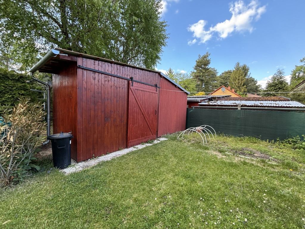 Az udvar rendezett fúrt kúttal és egy praktikus, 12 m²-es tárolóval.