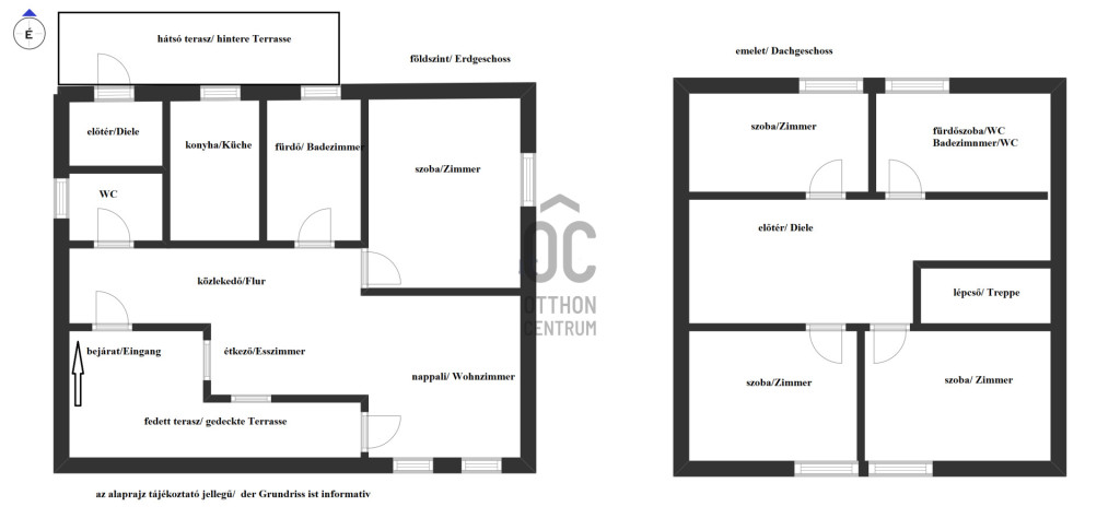 földszint: déli fekvésű fedett terasz, nappali, étkező, konyha, kis előtér hátsó kijárattal, közlekedő, hálószoba, fürdőszoba, külön WC, hátsó terasz