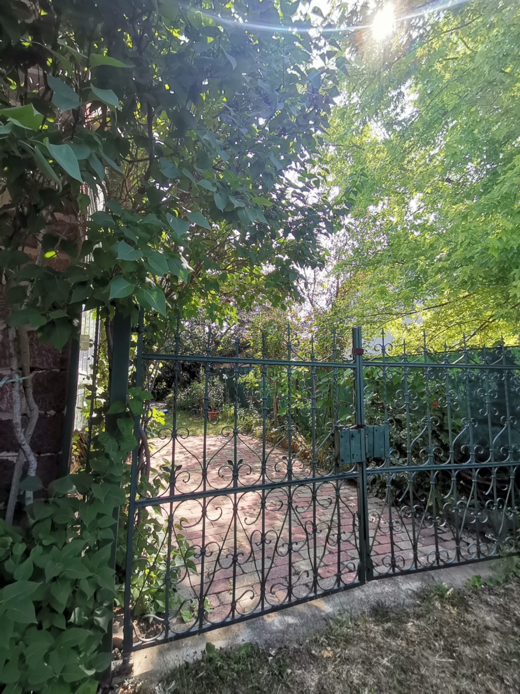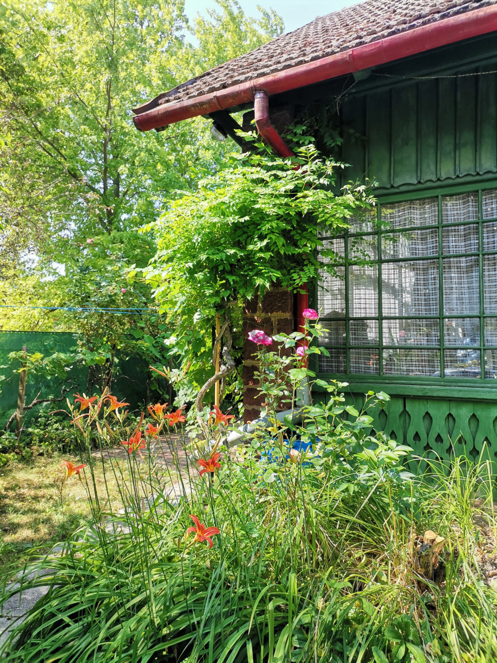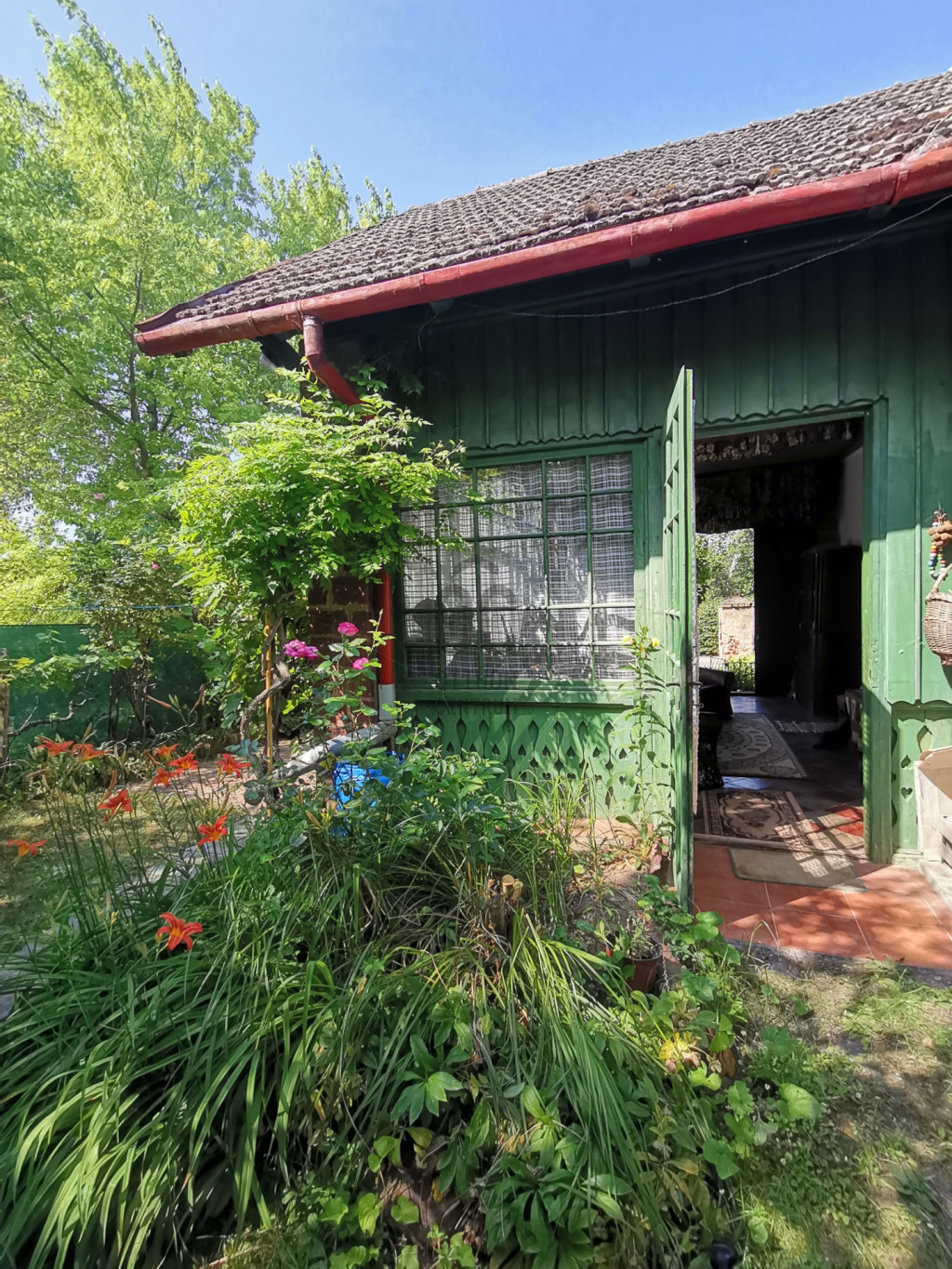 A kertben gyümölcsfák és dísznövények vannak, a hátsó udvari részben egy fedett tárolóhelyiség és egy nem használt kertrész is van (egykor baromfik számára)