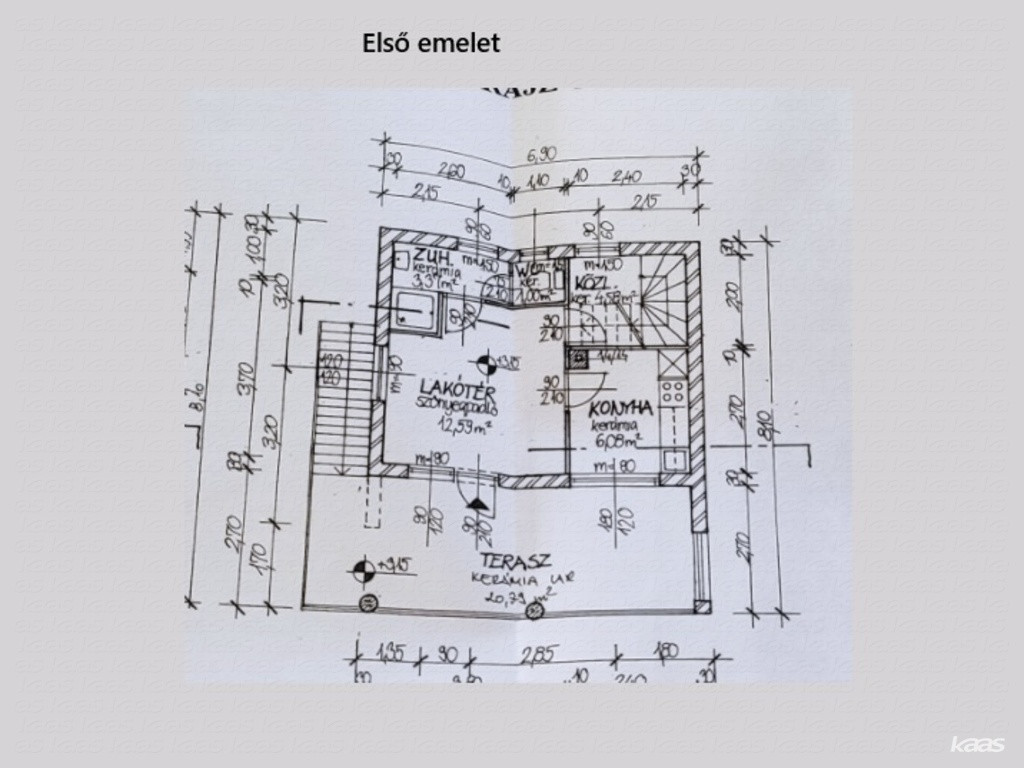 - Első emelet: egy nagy szoba, fürdőszoba WC-vel, közlekedő, beépített terasz