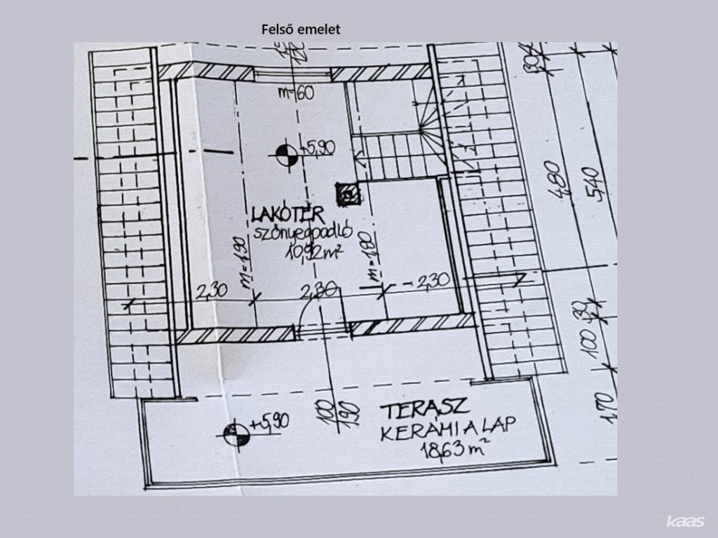 - Felső szint: egy szoba, valamint egy nagy terasz
