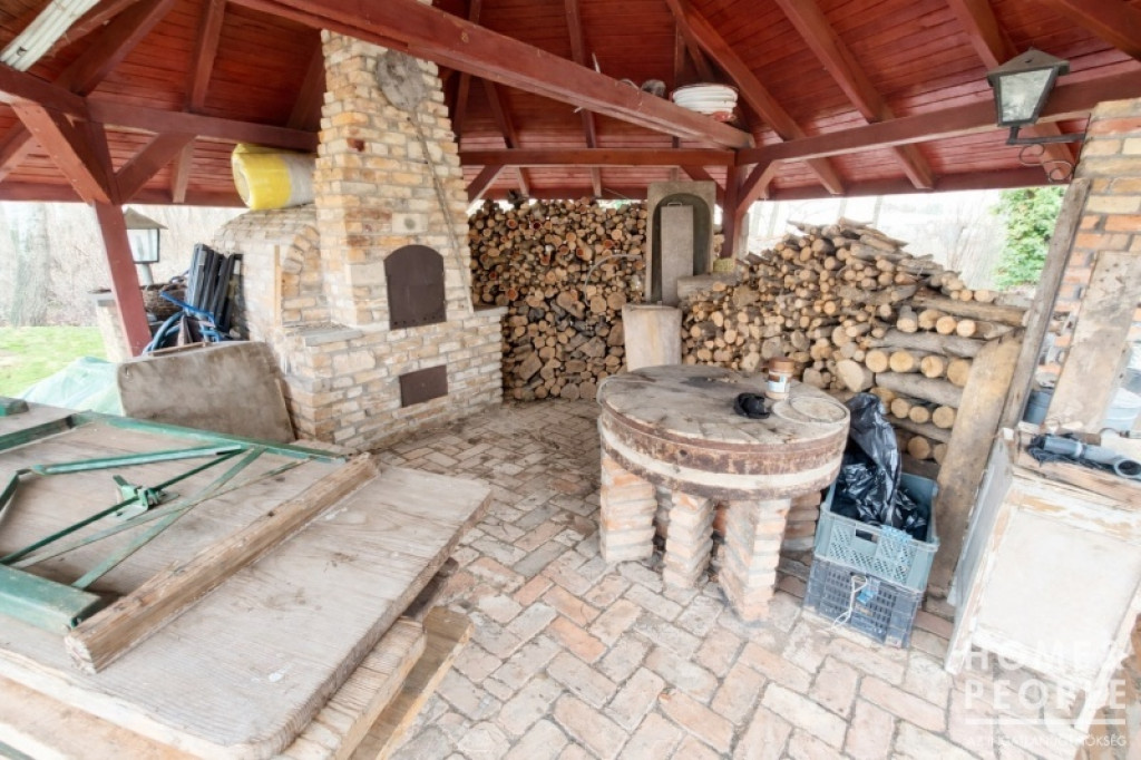 A másik épület földszintjén garázs, ürdőszoba, kazánház, pince 152 m2. Az emelet szálláshelyként üzemel.