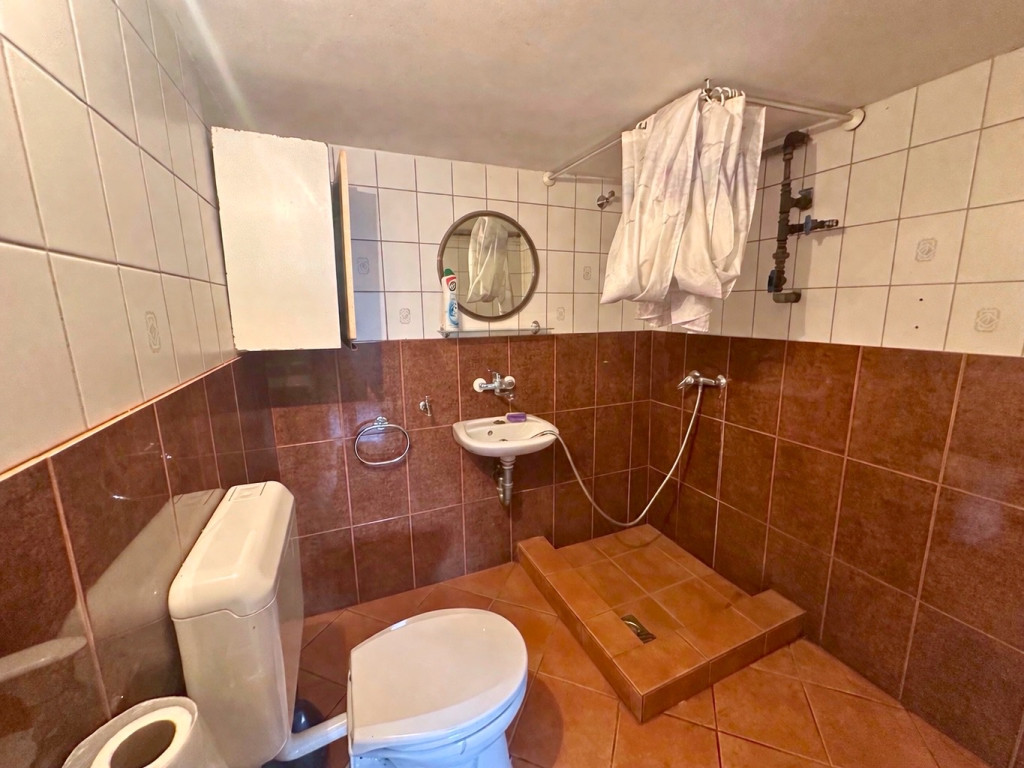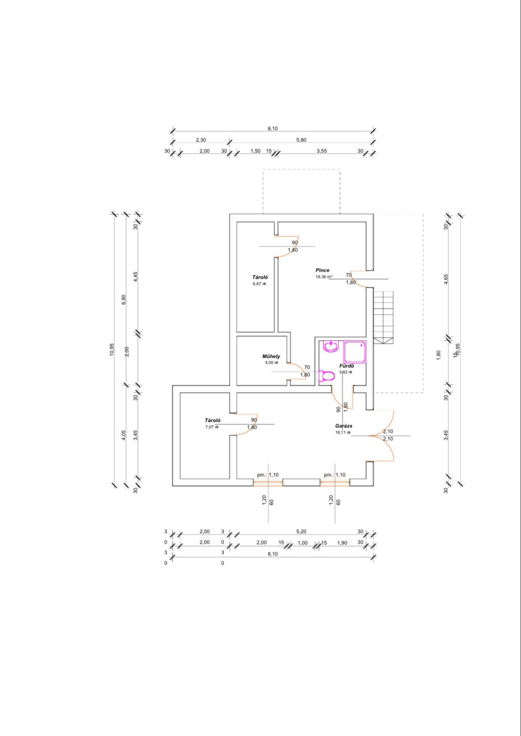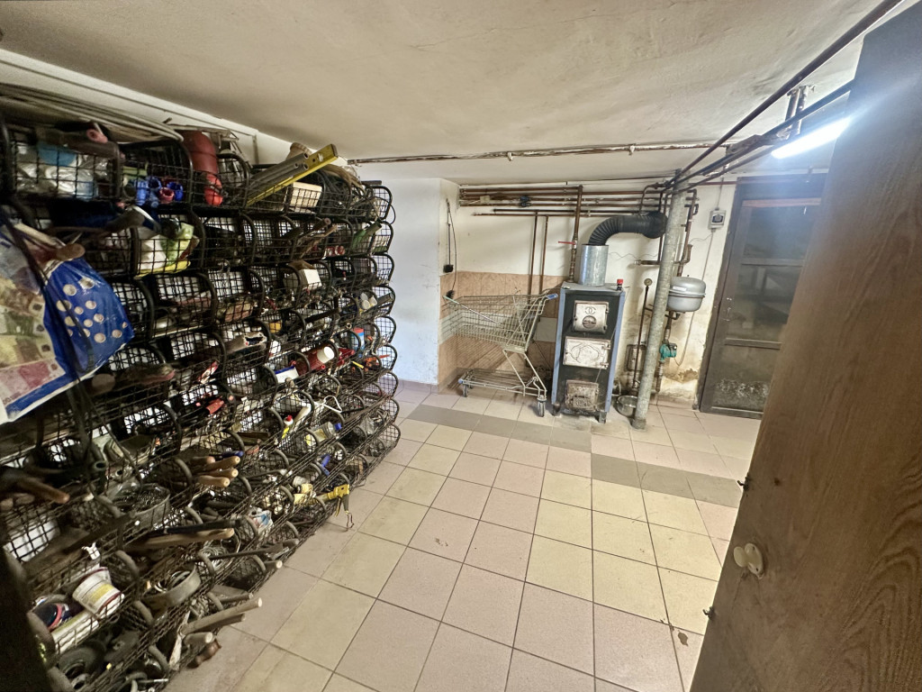 Pincében: tárolók, kazánház, garázs, valamint fürdő + WC egy térben.