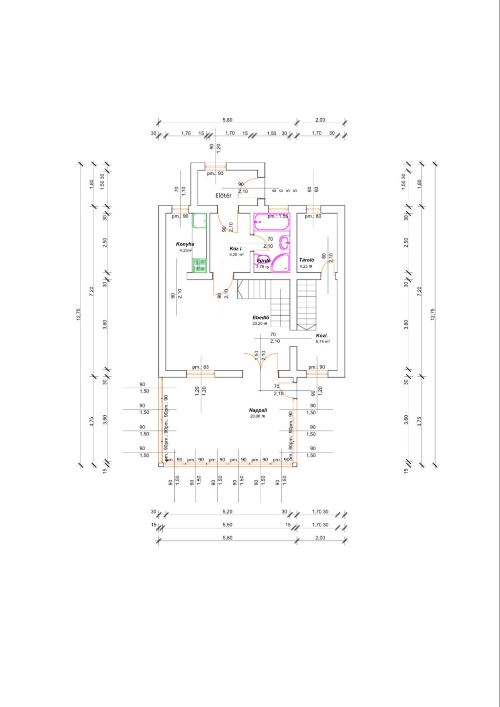 Földszinten: előtér, nappali, étkező, konyha – egy légtér, ahol együtt lehet a család.