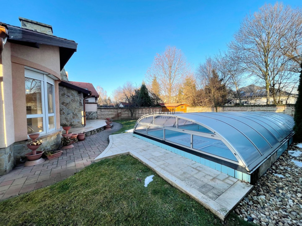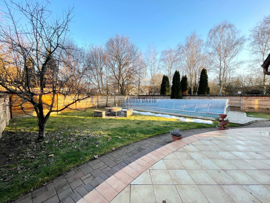 Udvar: térkövezett és füvesített, grillezővel, medencével, kerti tárolóval