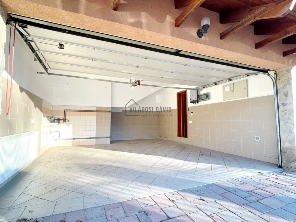 Földszint: Nappali-konyha-étkező-kamra teraszkapcsolattal, 1 szoba, fürdőszoba-zuhanyzóval + WC + bidé, háztartási helyiség, dupla garázs, terasz (kinti konyha)