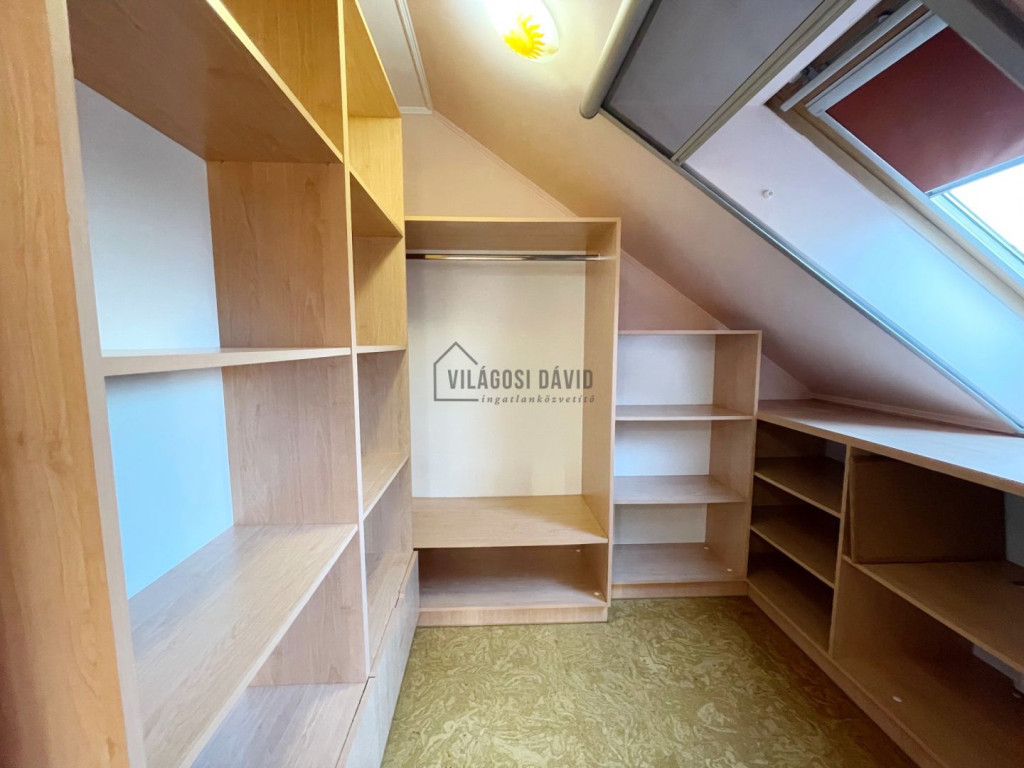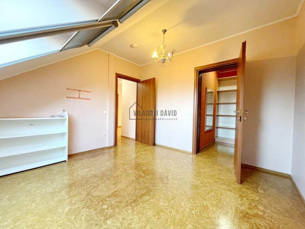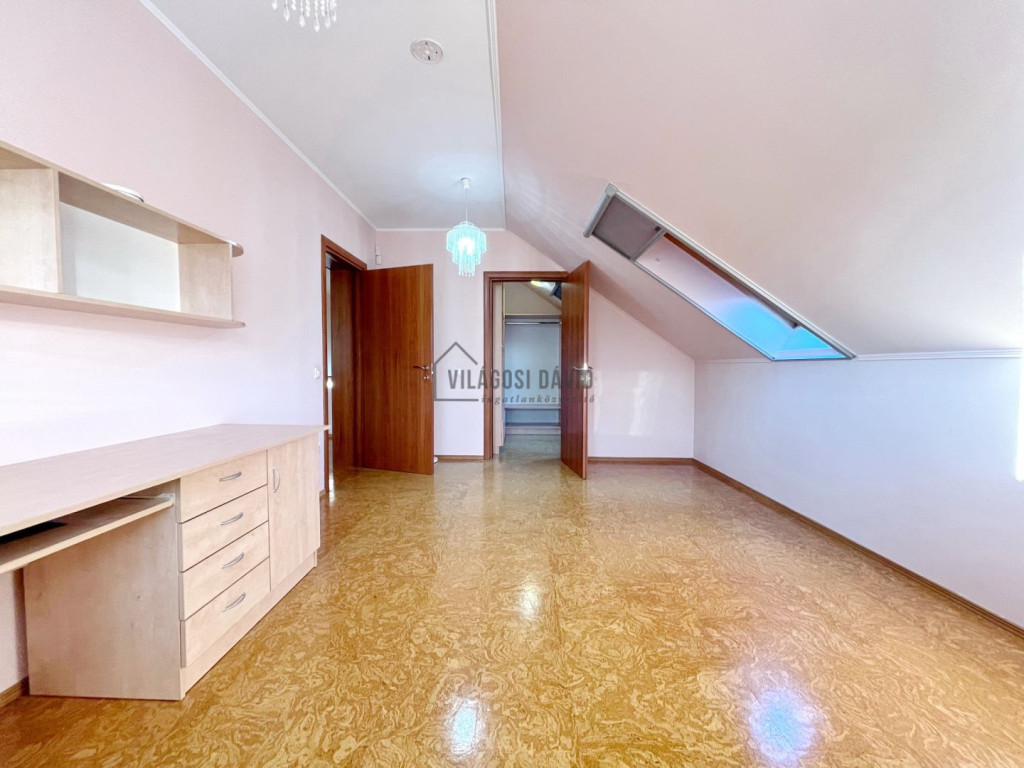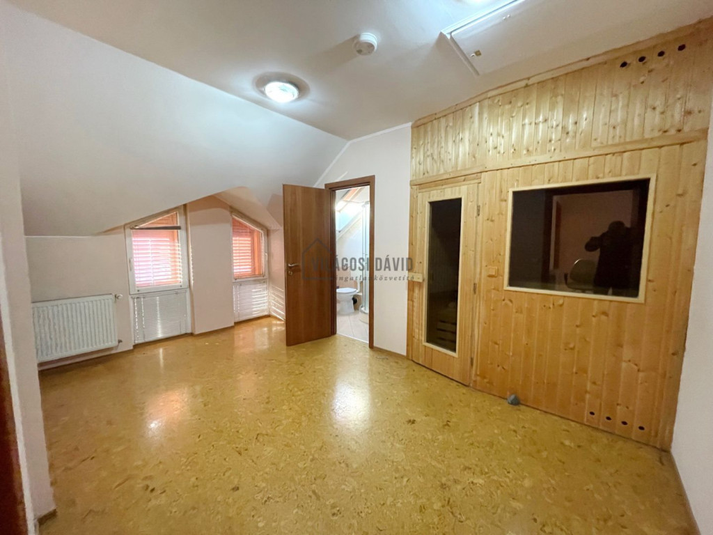 Emelet: 3 hálószoba + gardrób, 1-es fürdőszoba (káddal)+ WC/bidé, 2-es fürdőszoba (zuhanyzó) + WC, szauna,