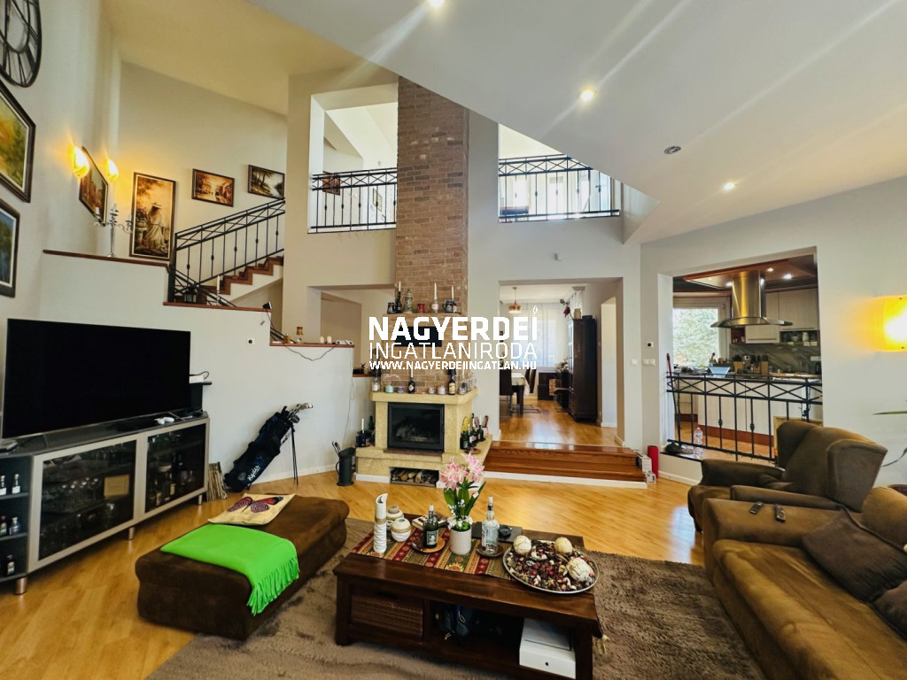 A földszinten, terasz, konyha, étkező, magas belmagasságú nappali kandallóval, hálószoba, fürdőszoba található.