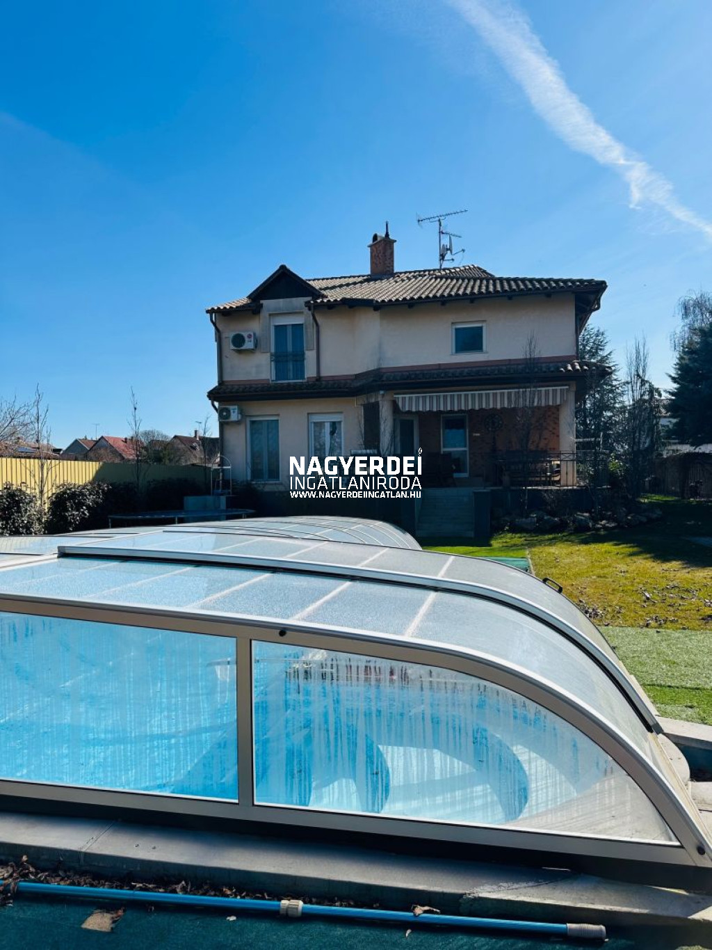 A kertben fedett nagyméretű, fűthető medence, trambulin és főzési-grillezési lehetőség.