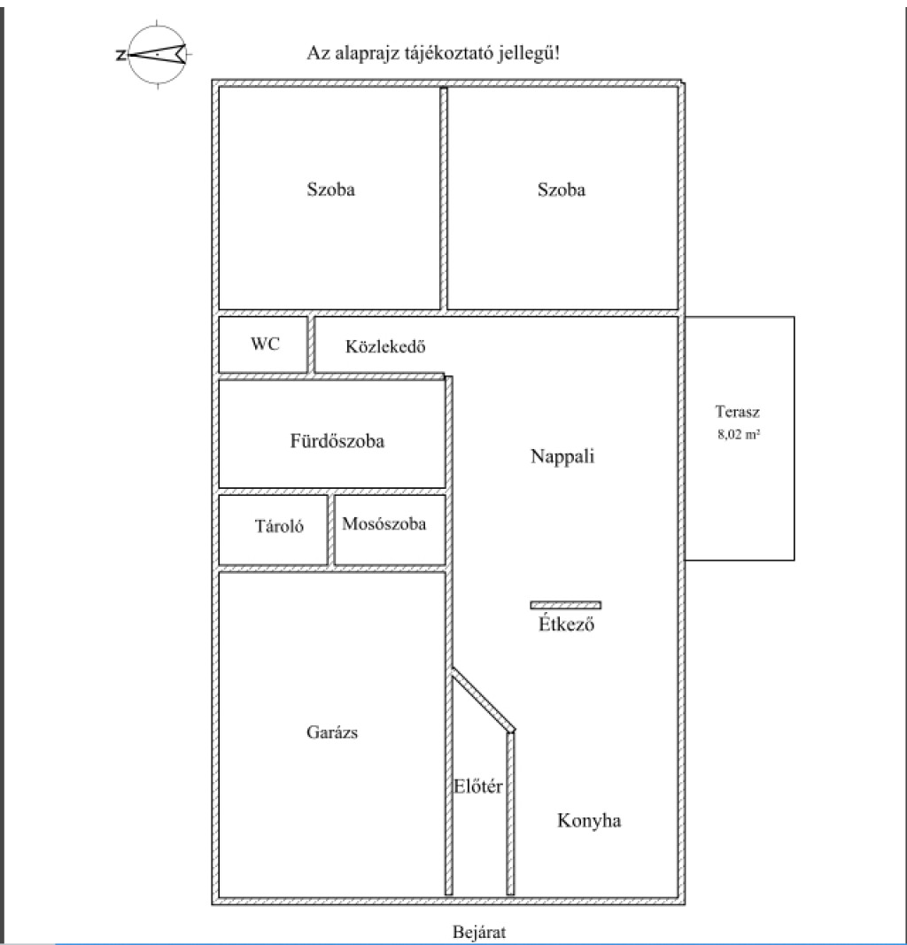 - A házban amerikai konyha-étkező-nappali, két szoba, fürdőszoba (káddal és zuhanyzóval), közlekedő, előtér, modókonyha, tároló, garázs, terasz, az udvaron újabb garázs és egy fedett, nyitott tároló található.