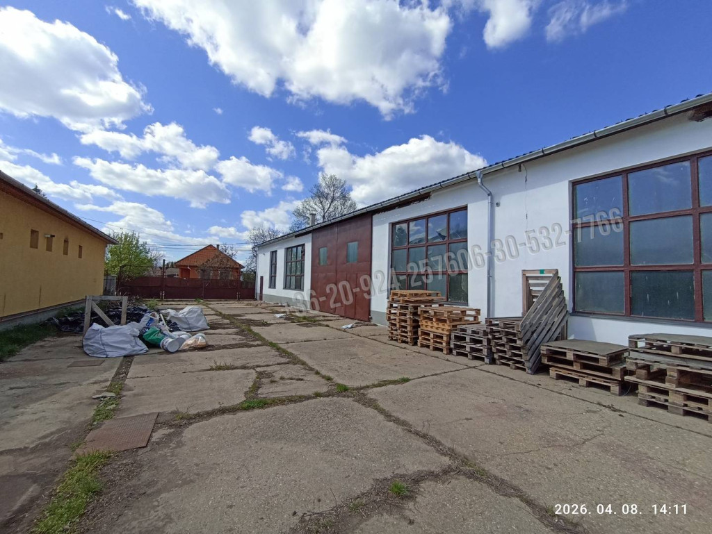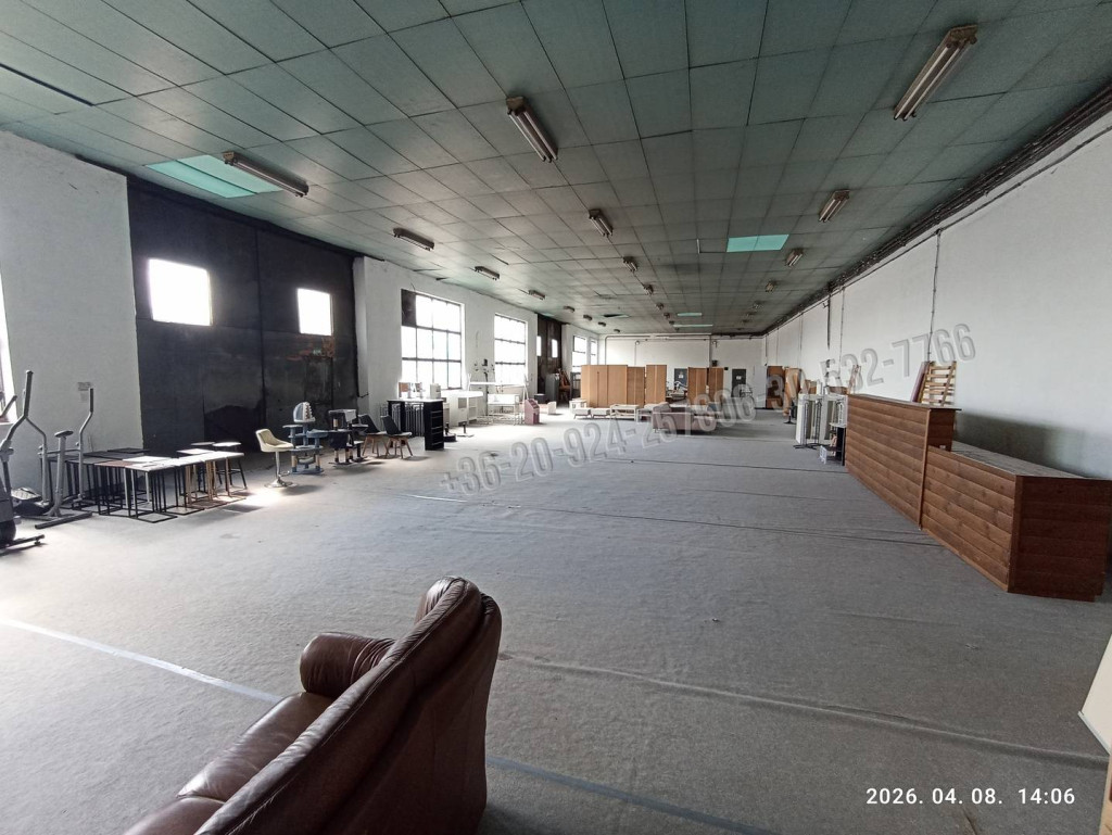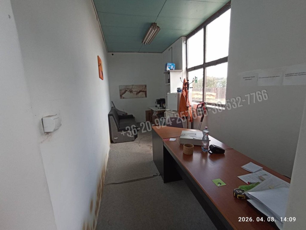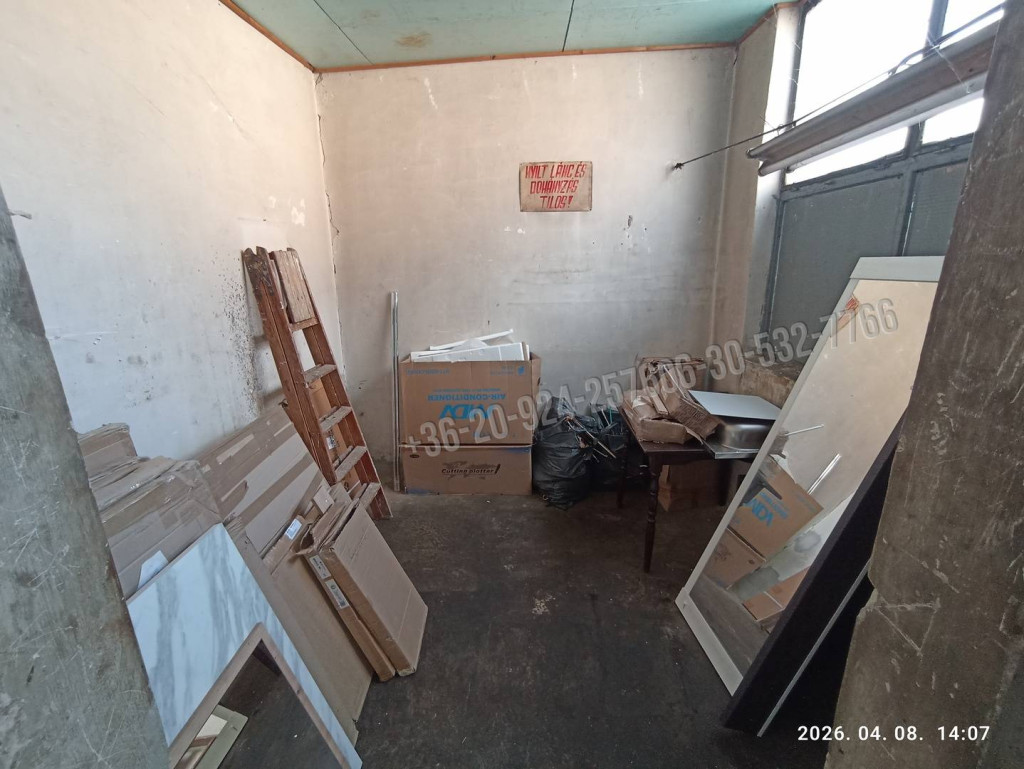 Helyiségek: tágas csarnok, raktárhelyiség, iroda, szolgálati tartózkodó