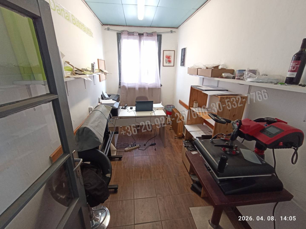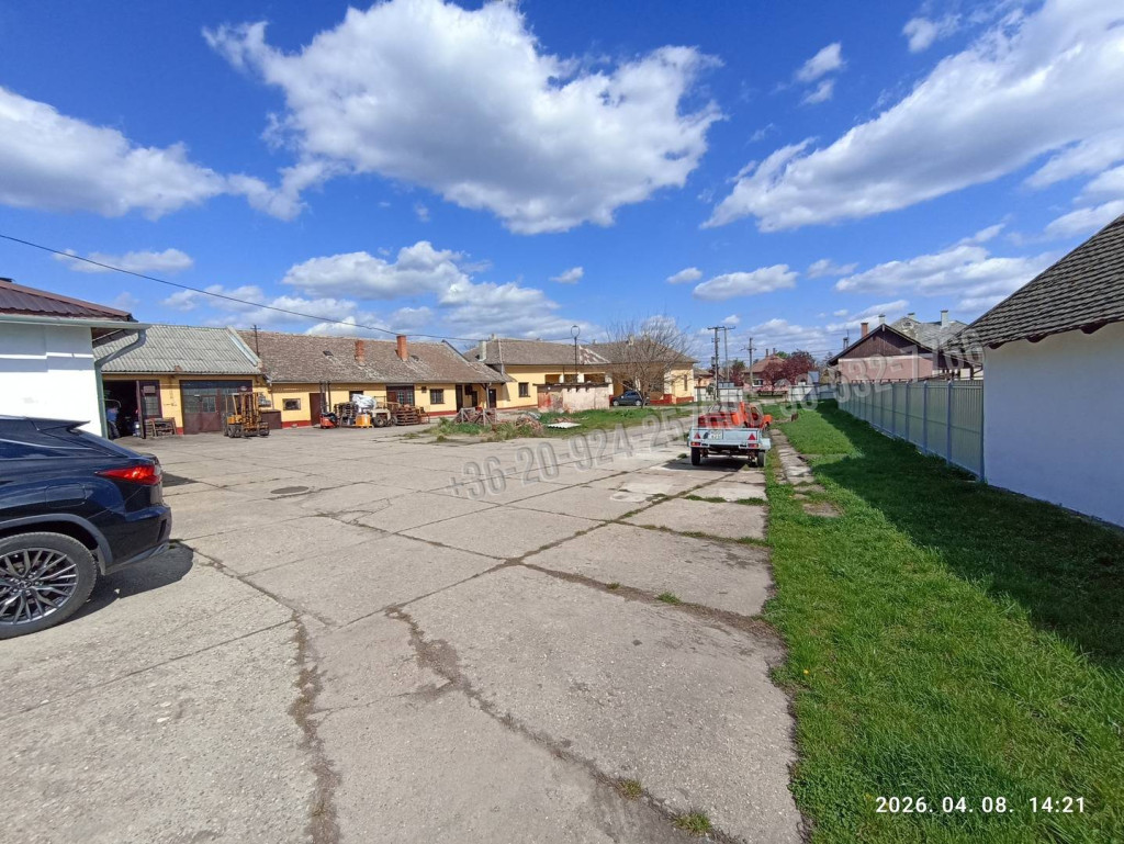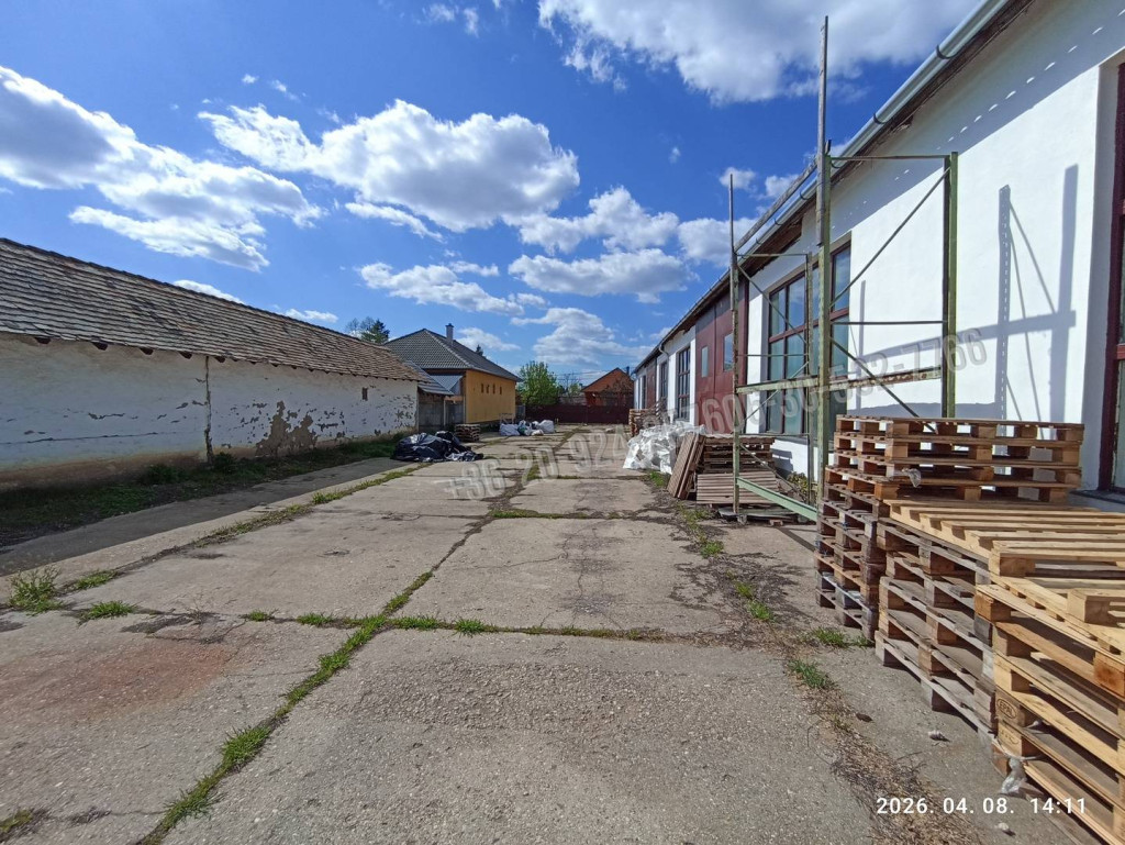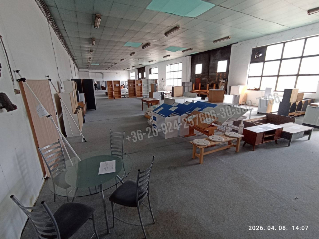 Helyiségek: tágas csarnok, raktárhelyiség, iroda, szolgálati tartózkodó