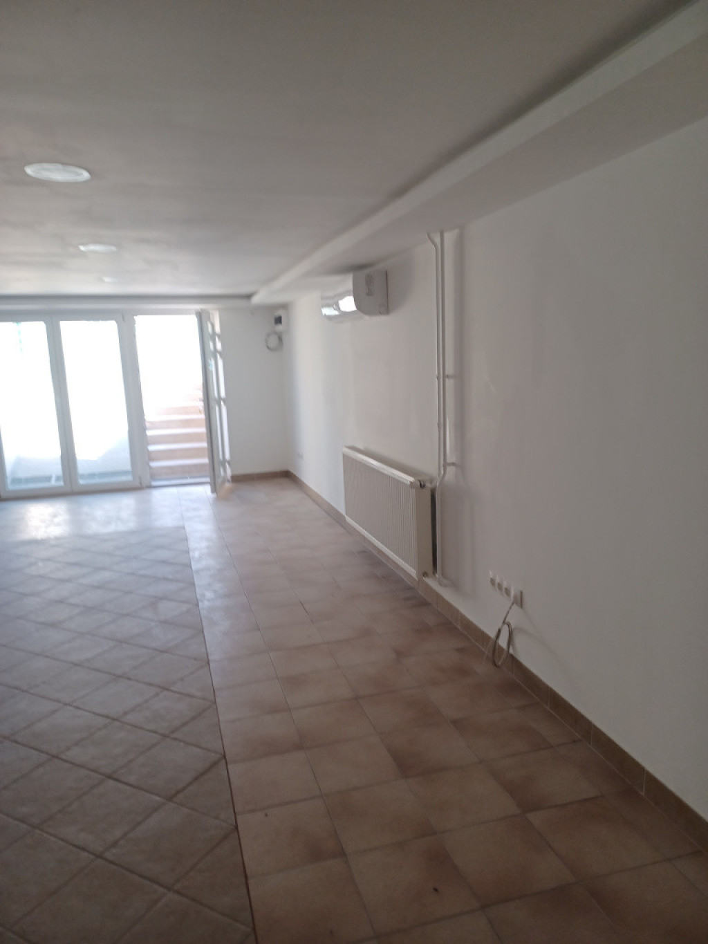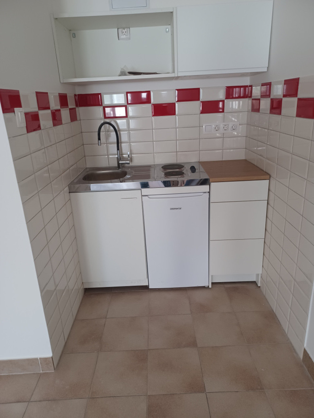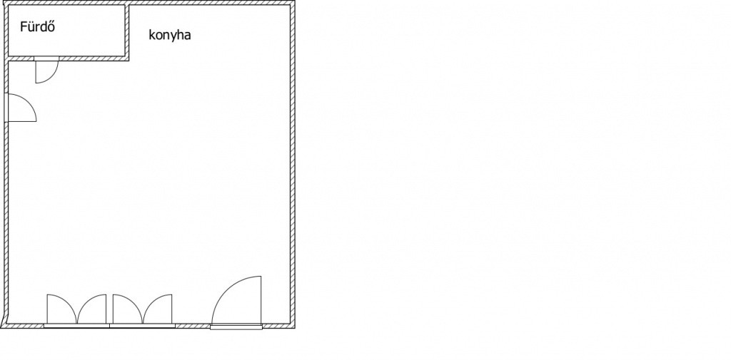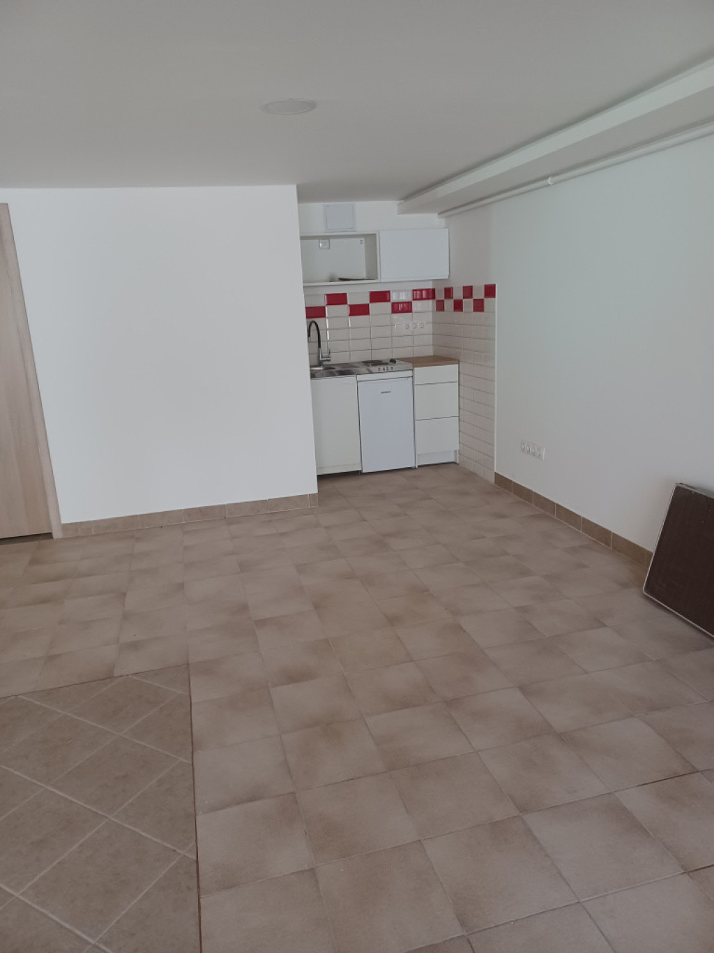 A helyiség bútorozatlan. Külön konyha sarok, tusoló fürdőszoba és WC.