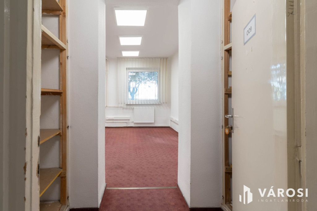 A 32 m2-es iroda az irodaház földszintjén helyezkedik el. A helyiség padlószőnyegezett.
