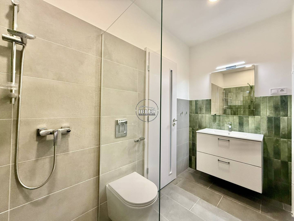 A fürdőszoba modern kialakítású: sík üvegfallal határolt épített zuhanyzó, sötétzöld mázas kerámiával burkolt hátfal, fiókos mosdószekrény és törölközőszárítós radiátor került beépítésre.