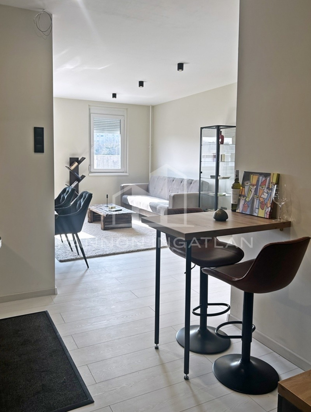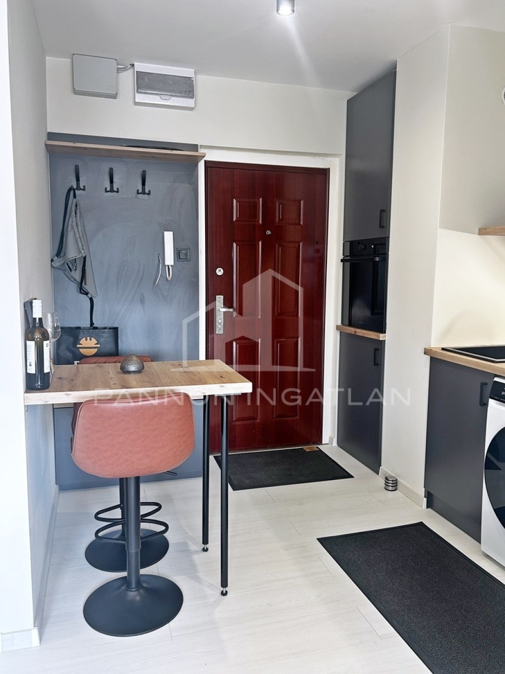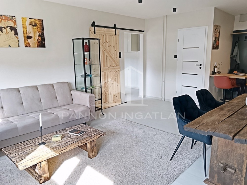A belső tér modern, letisztult és otthonos. A nappaliban kialakított rusztikus wabi-sabi hangulatú étkezőrész különleges karaktert ad a lakásnak, miközben az átgondolt térszervezés kényelmes mindennapi használatot biztosít.